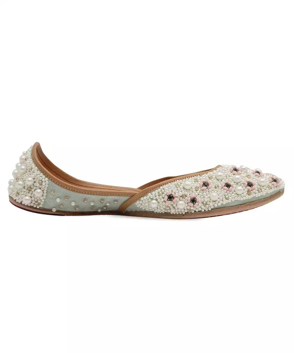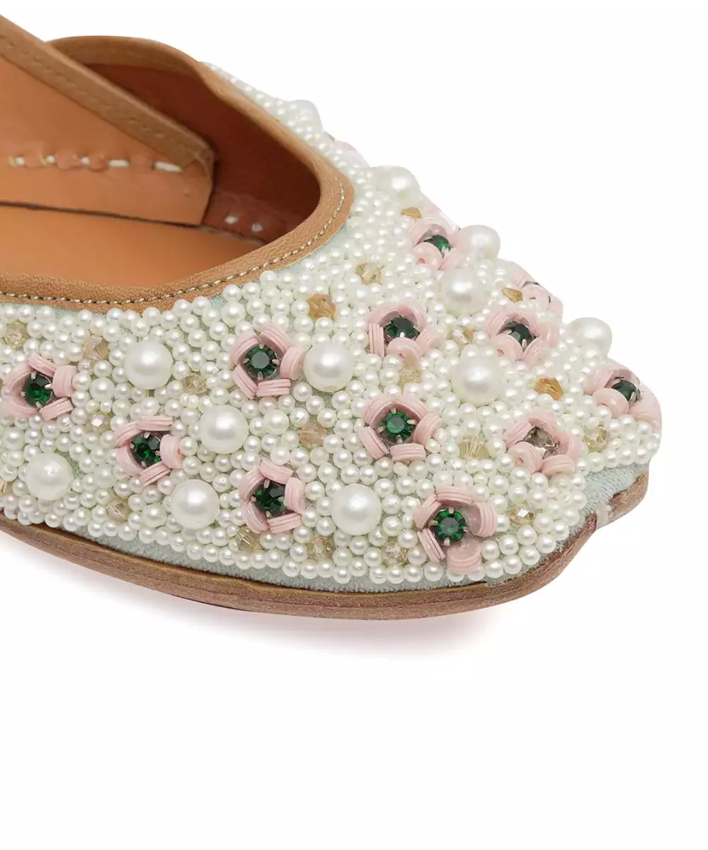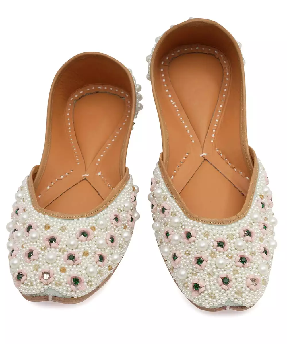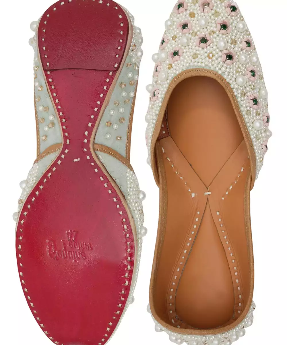 These White Embroidered Leather Mojaris Are A Perfect Blend Of Tradition And Elegance. Handcrafted From Premium Leather, They Feature Delicate Embroidery That Adds A Touch Of Sophistication. Comfortable And Stylish, They Pair Beautifully With Ethnic And Festive Outfits, Making Them An Ideal Choice For Weddings, Celebrations, And Special Occasions.