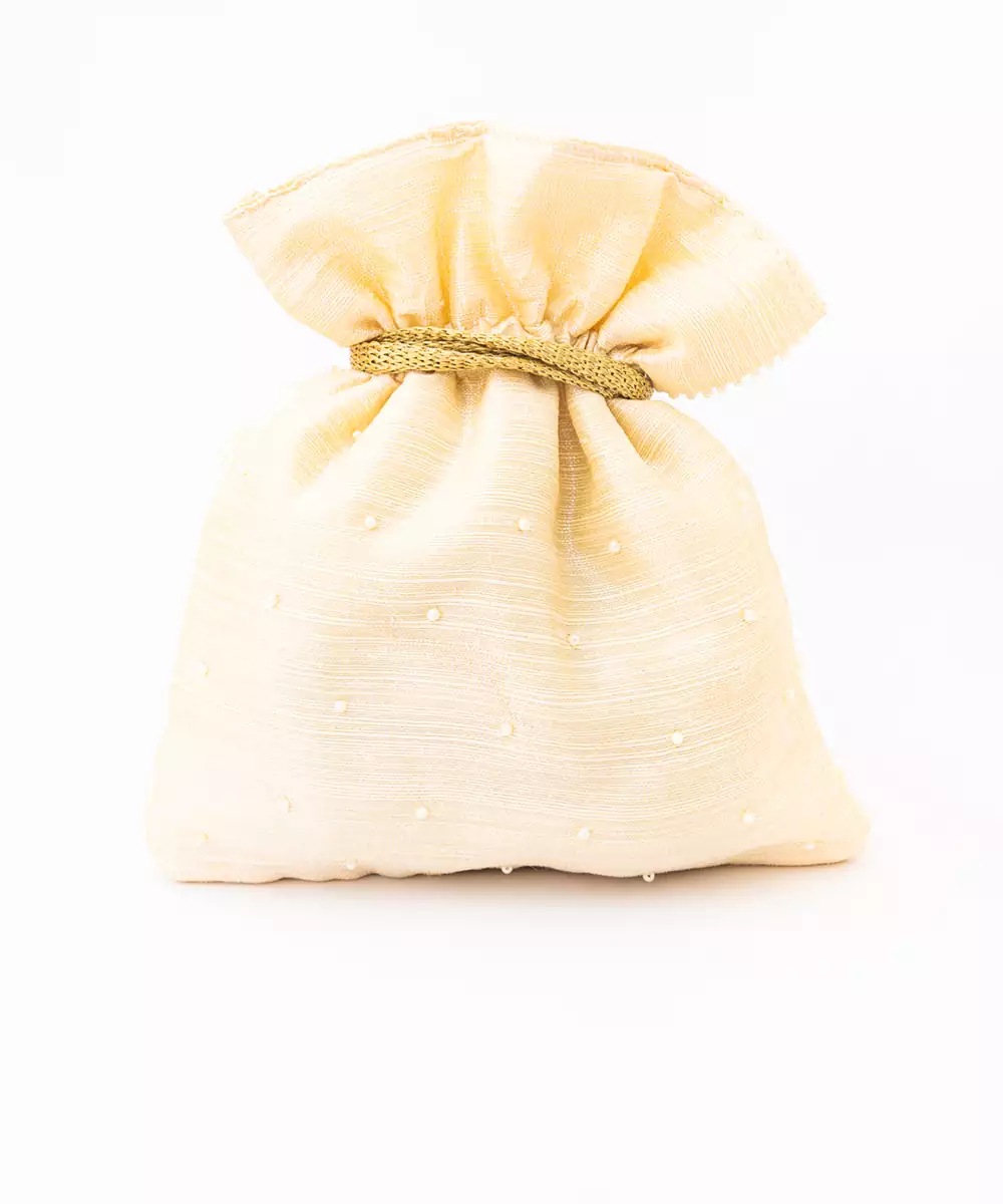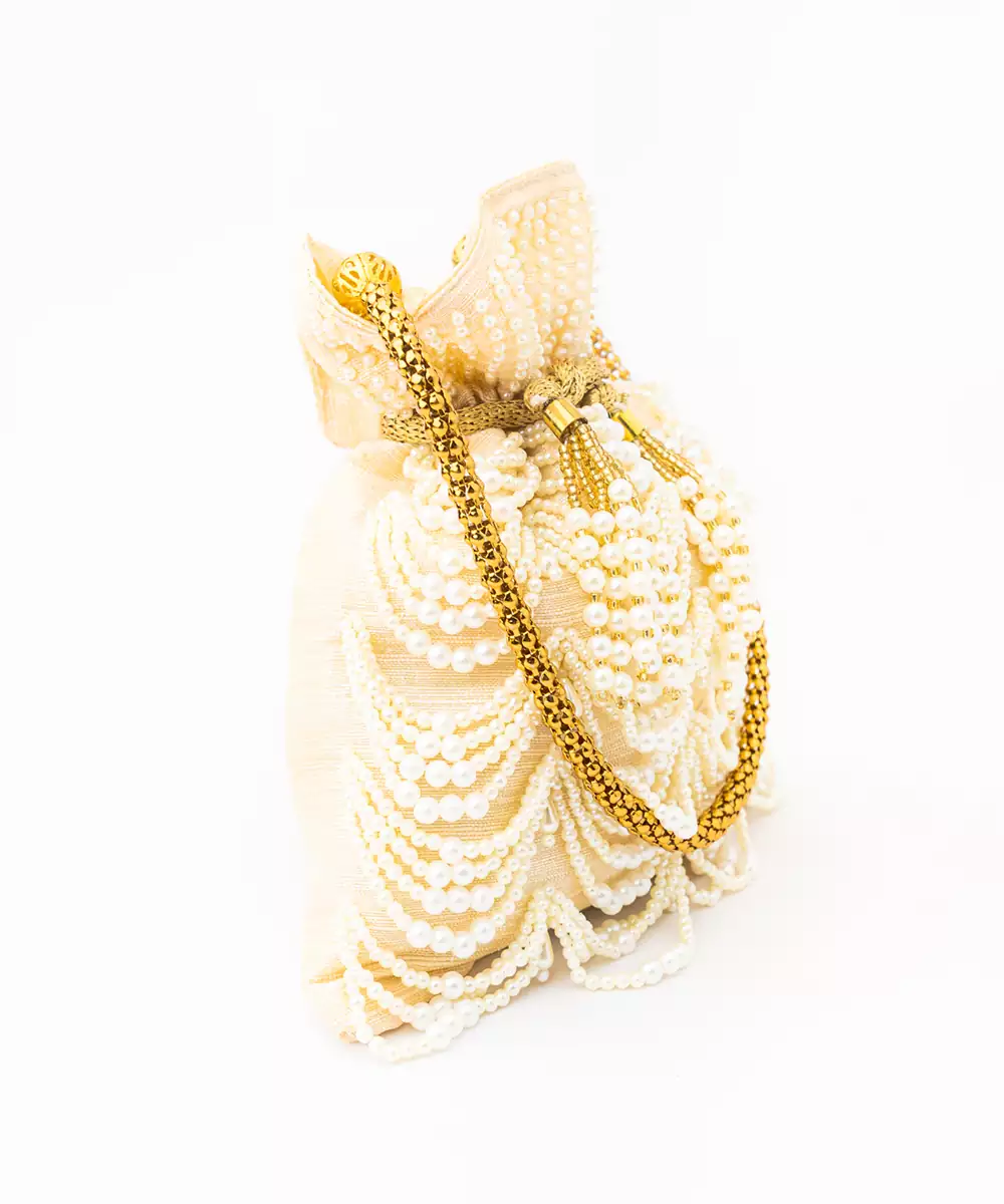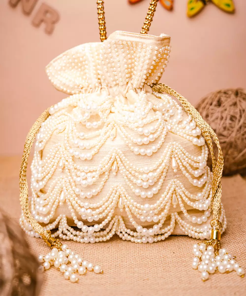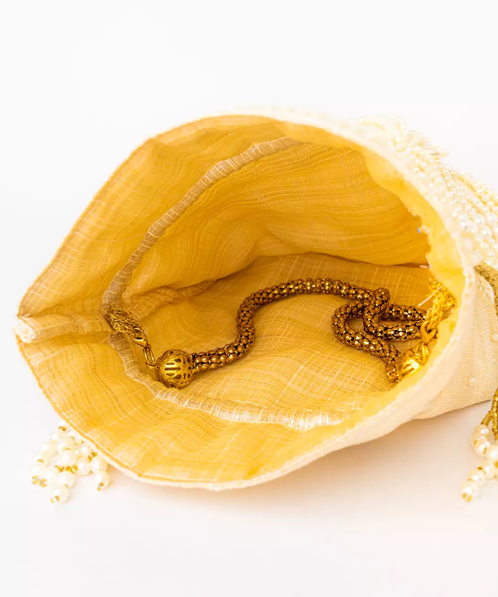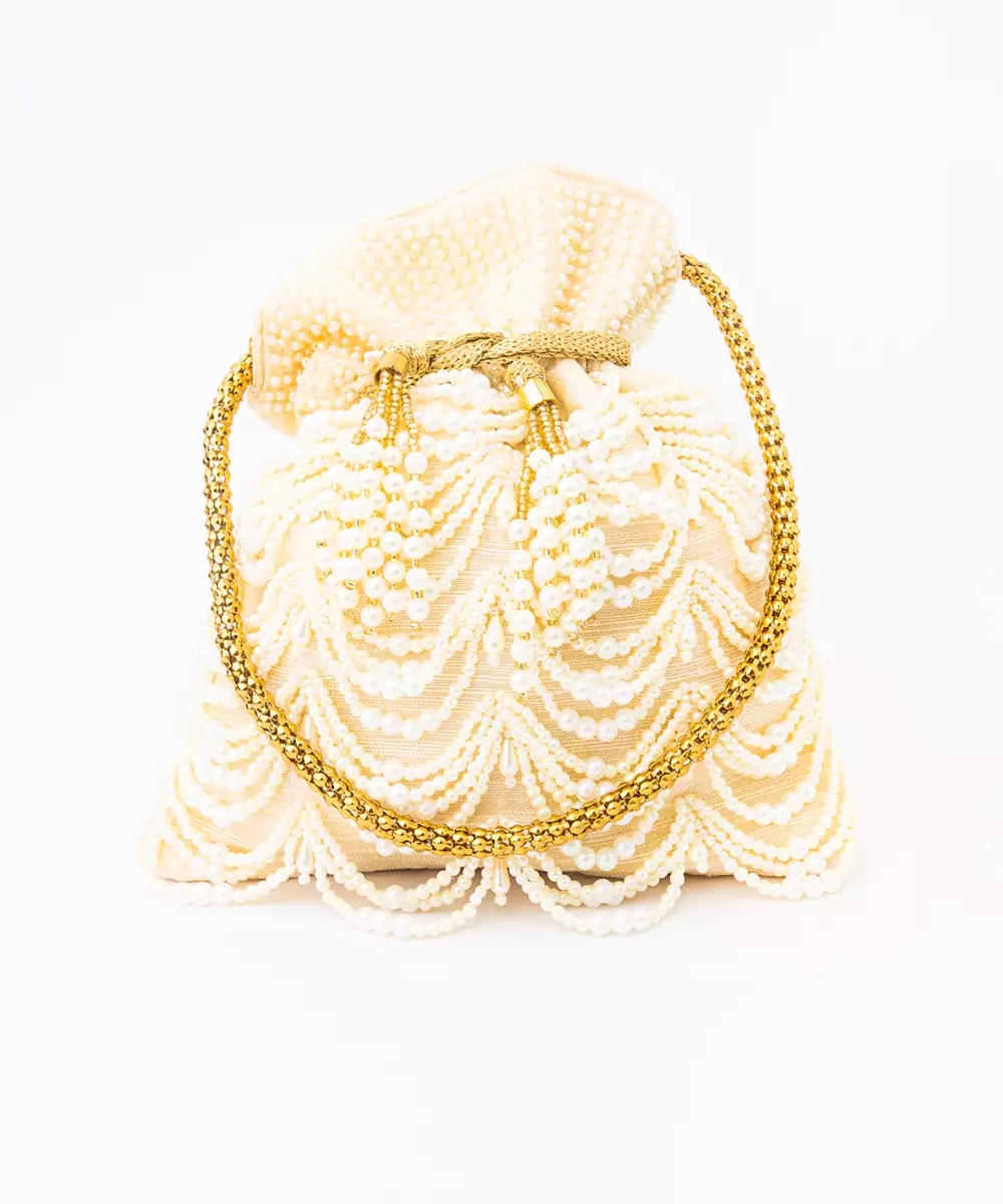 Embroidered In Refined Cream And Gold Tones For A Graceful And Festive Appeal. Classic Potli Silhouette Enhanced With Drawstring Closure For Secure And Traditional Charm. Includes One Main Compartment Ideal For Carrying Small Essentials Effortlessly. Comes With A Wrist Loop For Handheld Styling Ease And Ornamental Grace. A Beautiful Accessory Perfect For Weddings, Sangeet Nights, Or Ethnic...