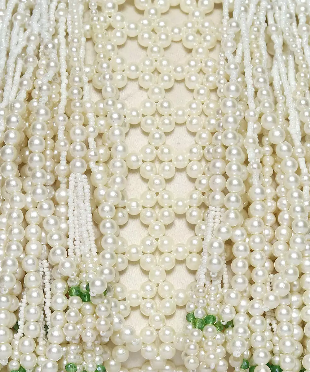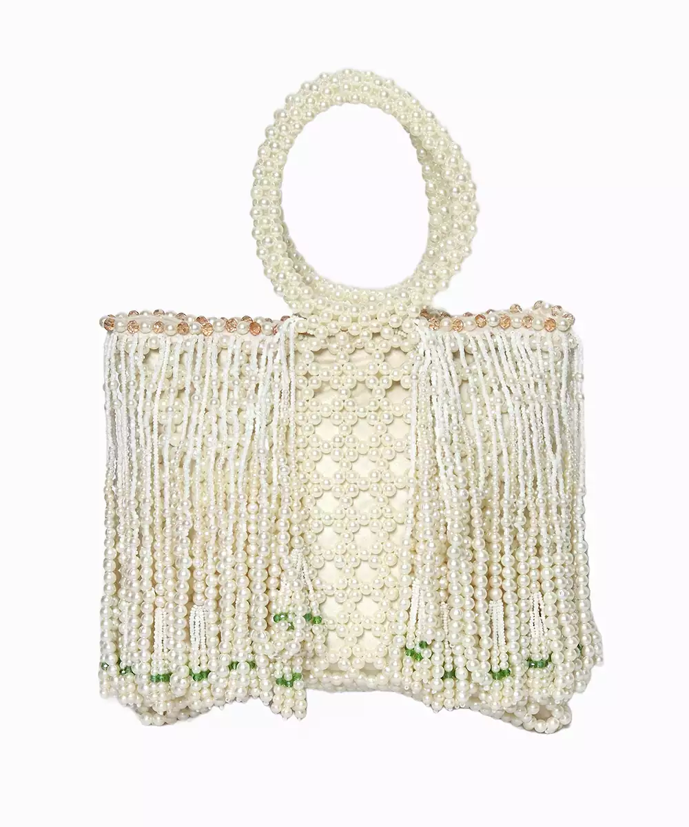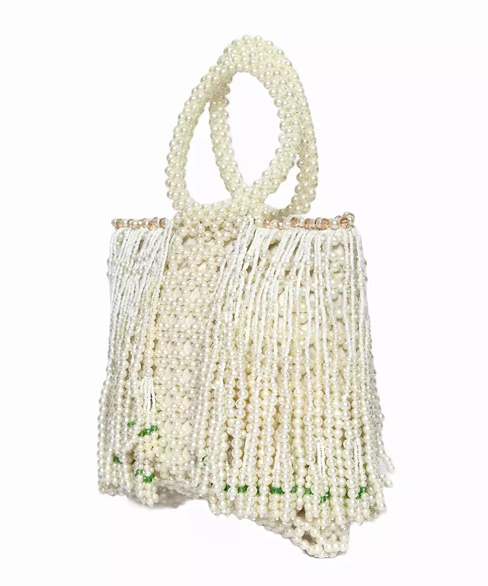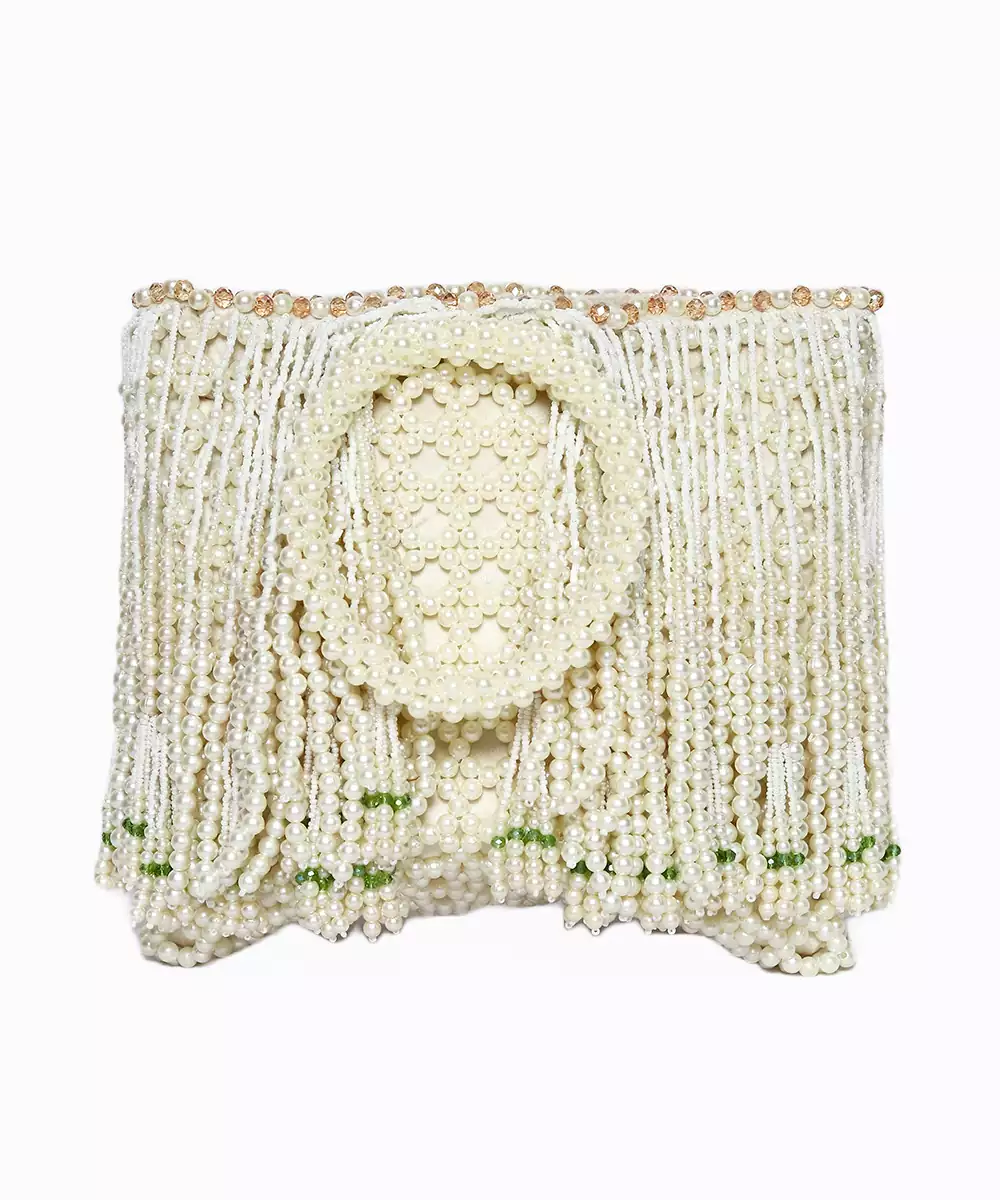 Pure White Base Adorned With Pearl Embroidery For Timeless Elegance. Features Dainty Tassels That Add Movement And A Festive Edge. Comes With A Shoulder Strap For Hands Free Convenience And Versatility. Button Closure Secures One Main Compartment For Your Essentials. Style Note: Team It With An Ivory Anarkali Or Pastel Lehenga For A Graceful, Regal Ensemble.