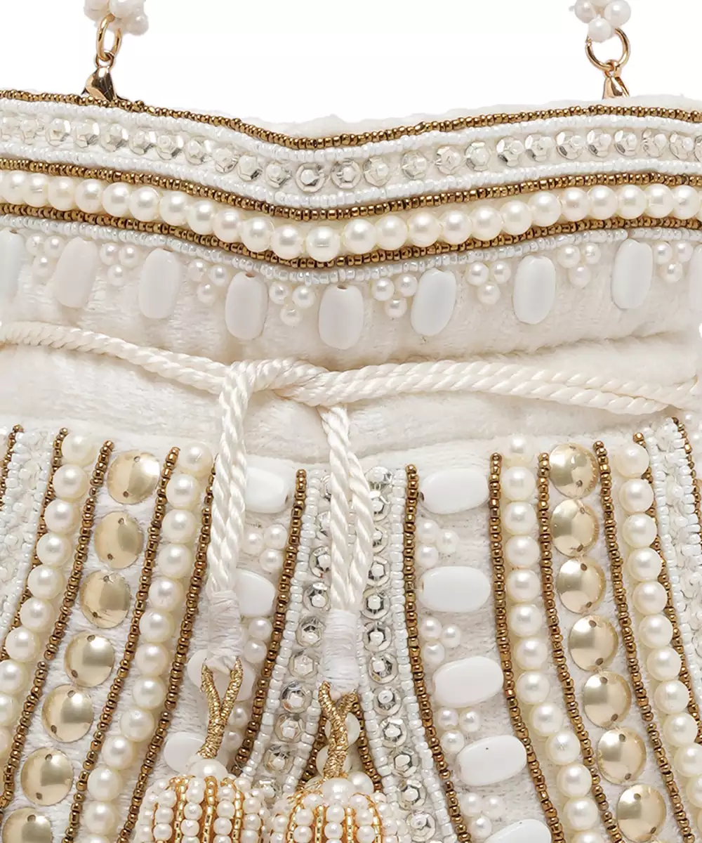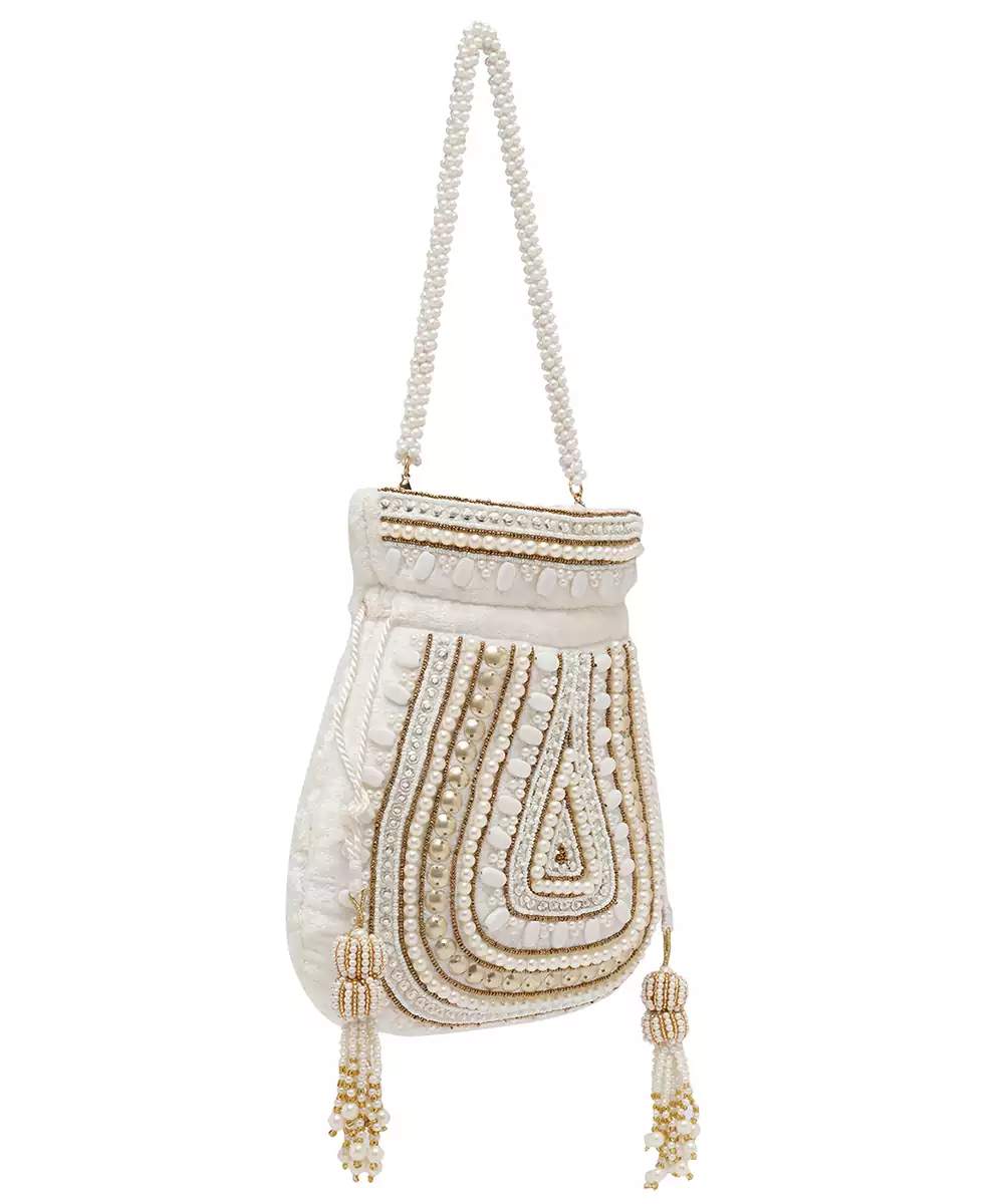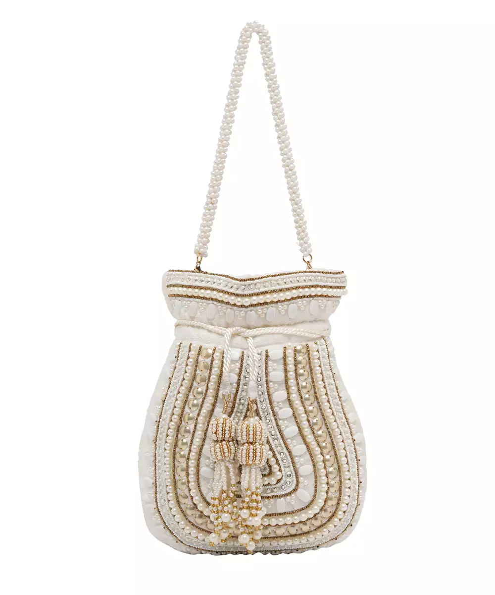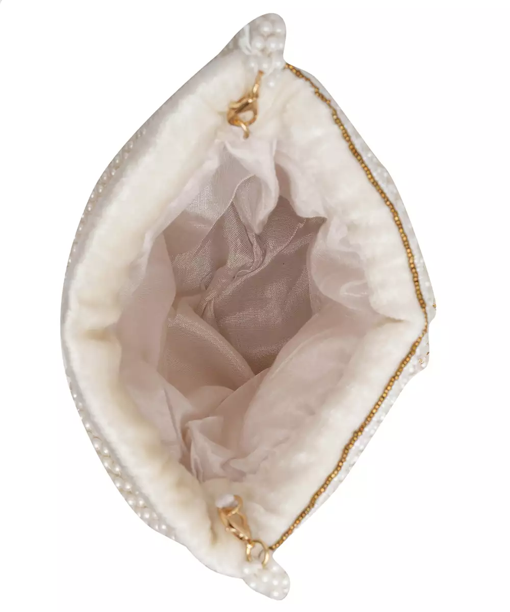 Traditional Potli Silhouette Adorned With Elegant White And Gold Embroidery. Satin Base With Shimmer Threadwork For A Refined Festive Touch. Comes With A Wrist Loop For Easy, Graceful Carrying. One Main Compartment Secured With A Drawstring Closure. Style Note: Pair With Ivory Lehengas Or Gold Toned Sarees For A Timeless Rakhi Or Bridal Ready Accent.