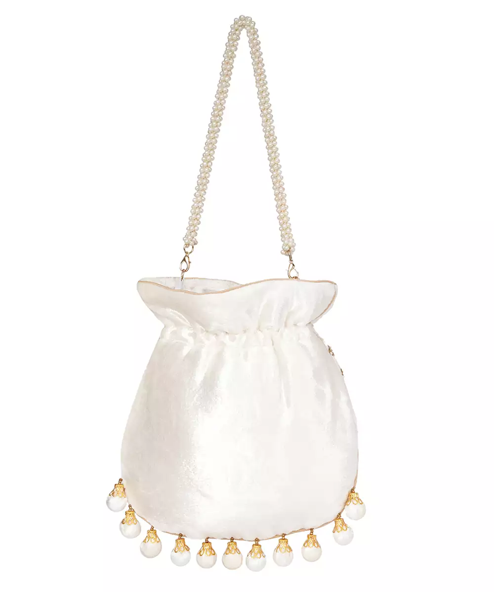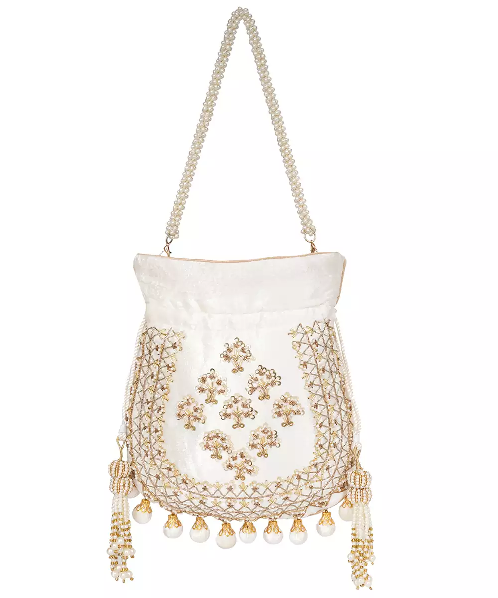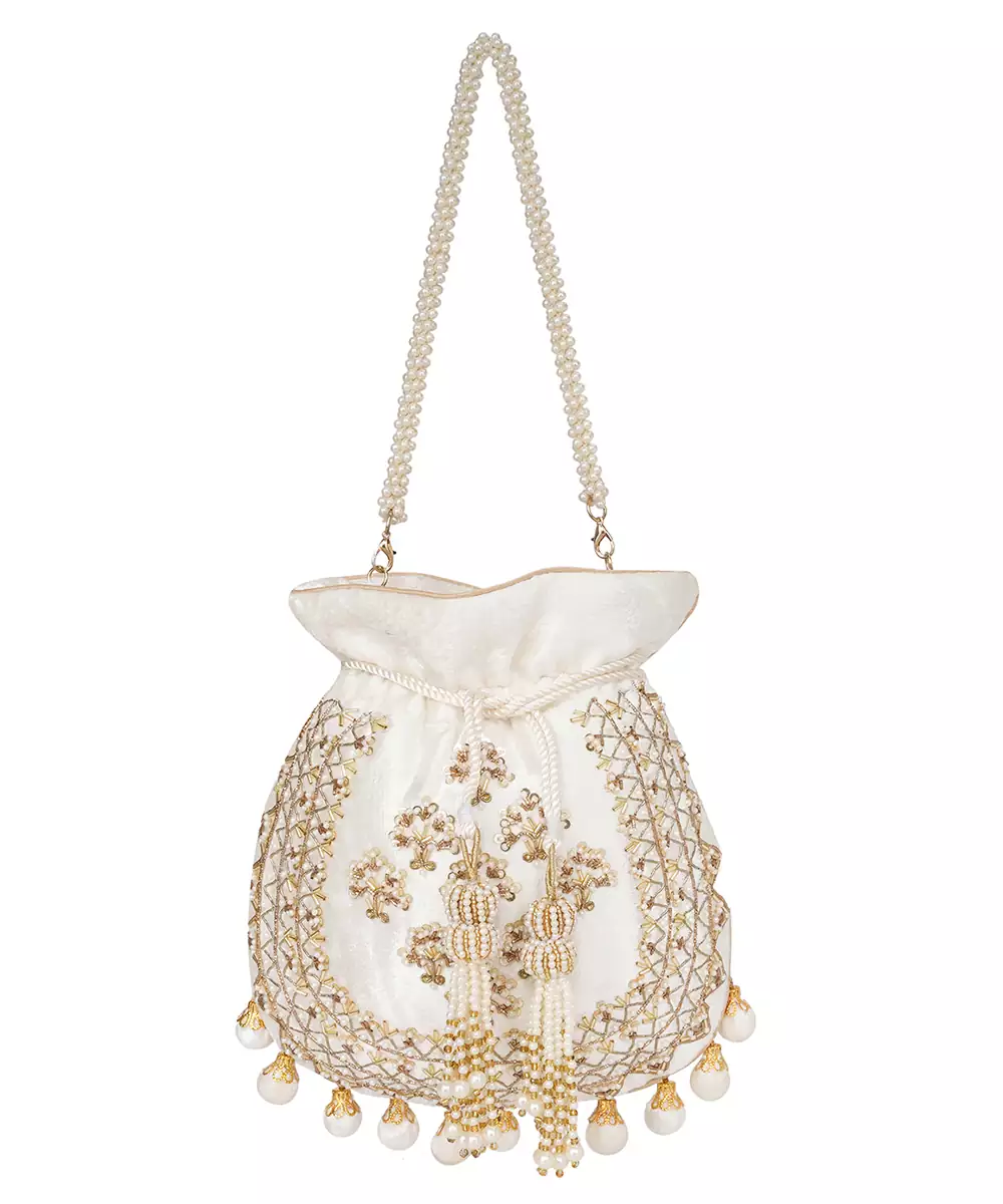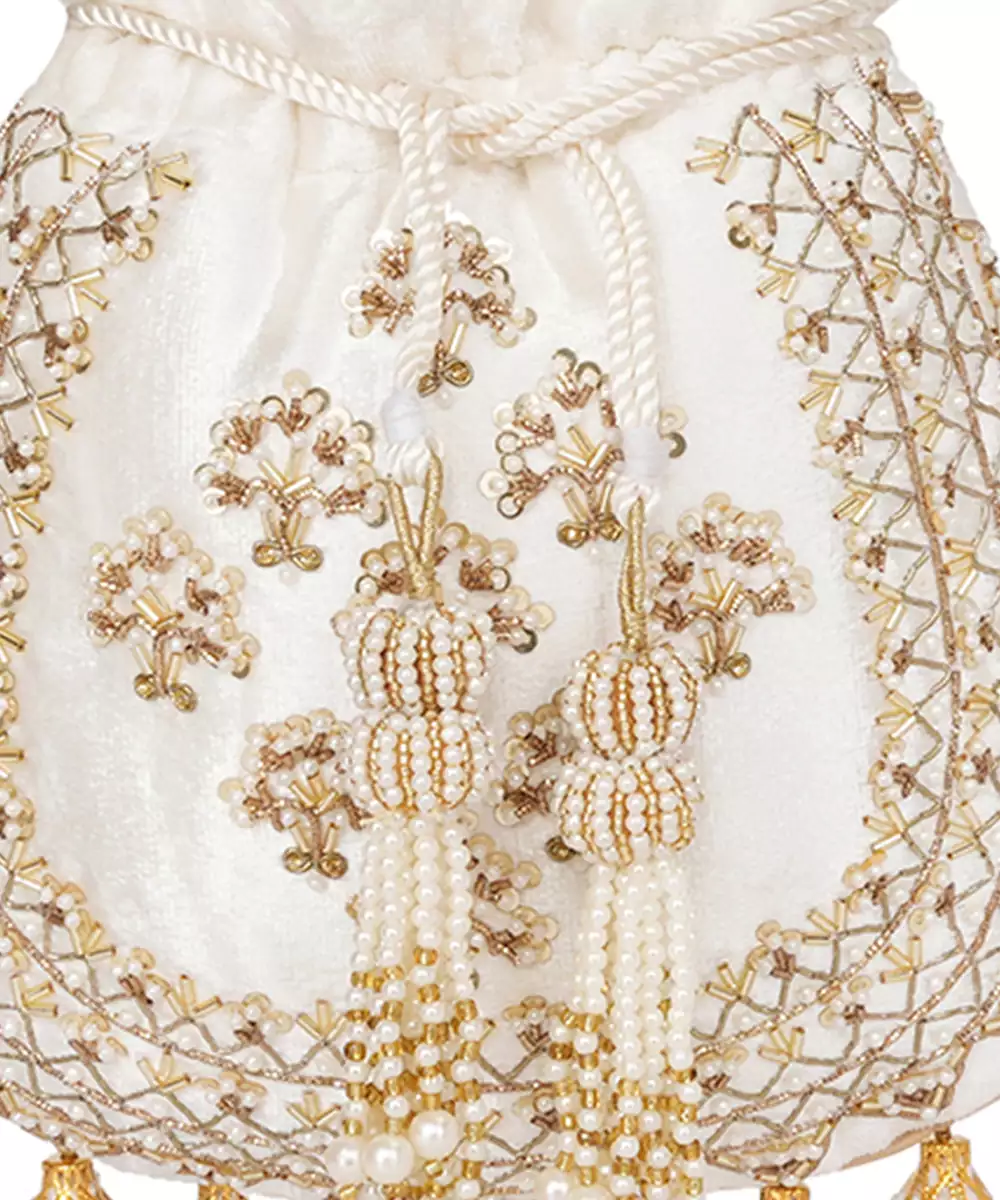 Elegant White Potli Clutch Adorned With Luminous Gold Embellishments For A Pristine Yet Opulent Look. Features A Secure Drawstring Closure And Roomy Interior For Essentials. Wrist Loop Adds Sophistication And Ease For On The Go Styling. Ideal For Haldi Functions, Engagement Parties, Or Bridal Trousseau Additions. Style Note: Contrast It With Jewel Toned Sarees Or Pastel Lehengas To Make The...