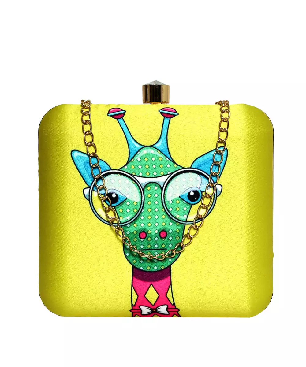 Features Cheerful Yellow Giraffe Print For A Quirky, Standout Appeal. Box Clutch Silhouette Adds Structure And Character To Casual Or Festive Styling. Includes Zip Detailing For Added Flair And Visual Interest. One Main Compartment Secured With A Twist Closure For Safe And Stylish Access. Comes With A Shoulder Strap For Hands Free Comfort And Playful Versatility.