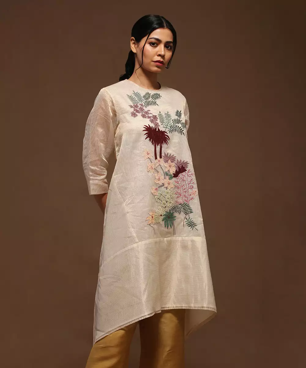 A Line Applique Yoke Kurta Set With Choker Neck And Fish Pattern Daman.
