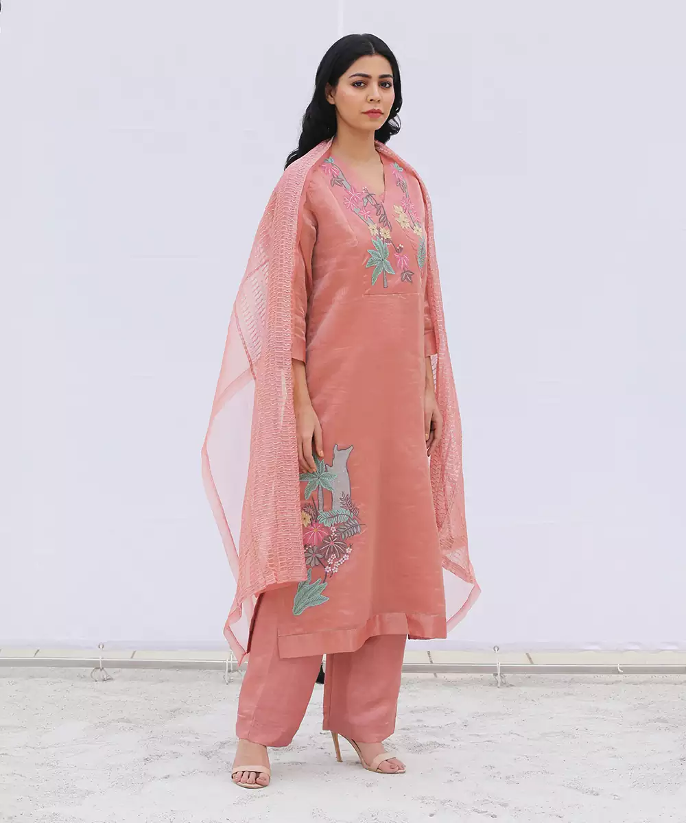 Three Piece Set Comprises Of An Applique Yoke Kurta , Parallels And Tissue Silk Dupatta.