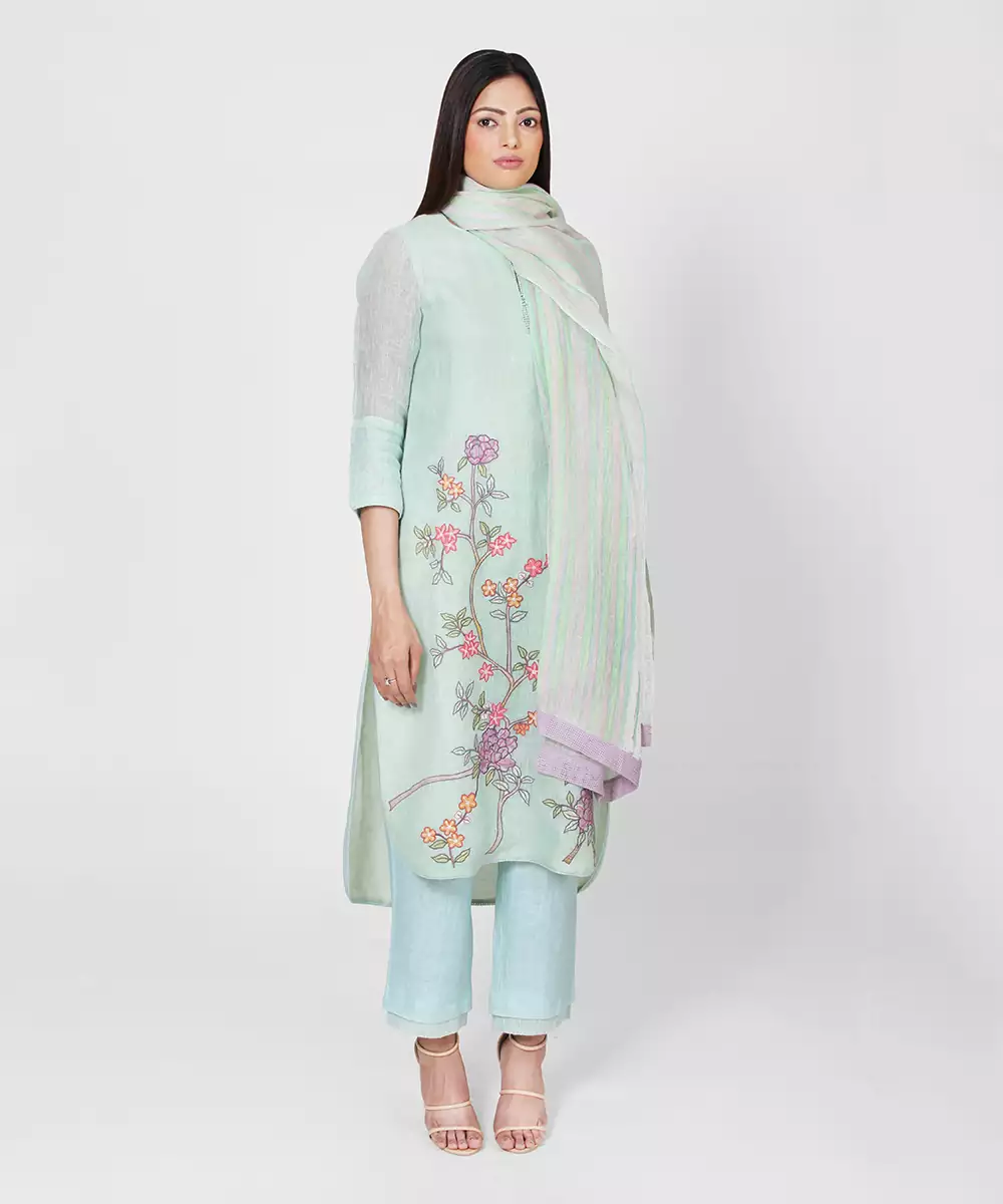 Featuring A Sea Green Kurta In Linen Base With Applique Embroidery. It Is Paired With Matching Straight Pants And A Digital Printed Dupatta.