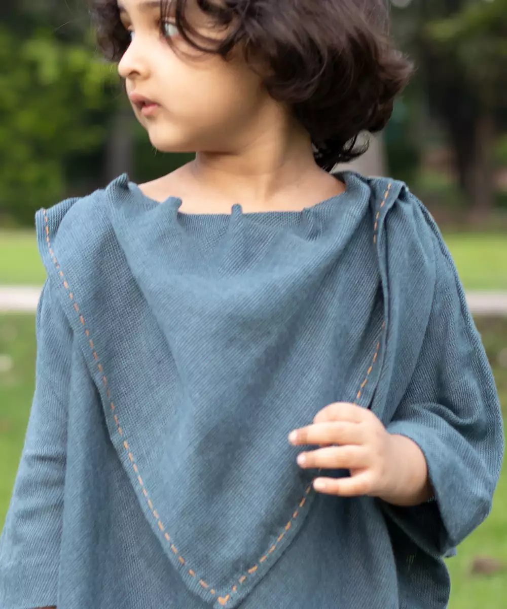 Featuring A Curious Blue Cowl Top In Linen Base With An Uneven Hemline, Triangle Shaped Flap, Wooden Buttons, And Kantha Embroidery. This Contains Only One Piece.