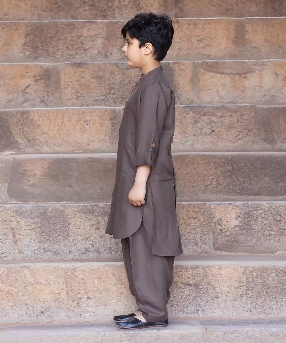 Featuring Night Forest Green Pathani Suit In Linen Base With A Band Collar, Pin Tucks At Front And Back, Wooden Buttons And Kantha Hand Embroidery. It Is Paired With A Linen Base Salwar