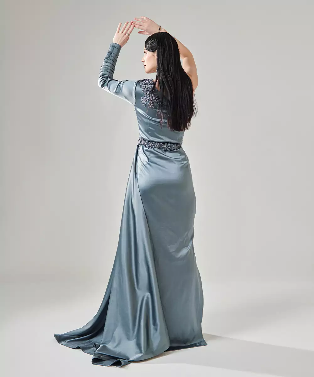 Cowl Detail Drape Gown With Side Train And 3 D Flower Embroidery ( Rhinestones, Katdana, Nalki, Beads ) Standard Gown Length Is 60 Inches. Train Length Is 64 Inches. Comes With A Detachable Fully Hand Embroidered Belt