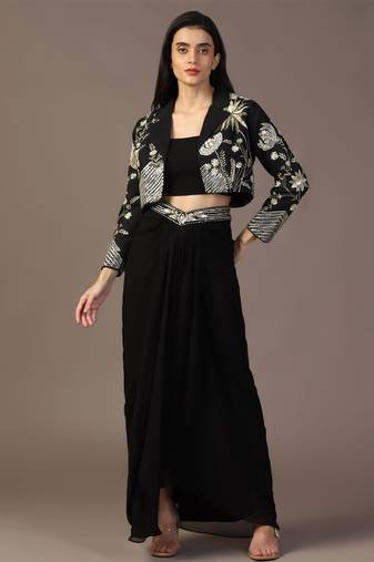 One Shoulder Scallop Hand Embroidered Corset Top With Tie Back Detailing; Matching Bustier And Kalidar Skirt Fitted From Waist To Hip
