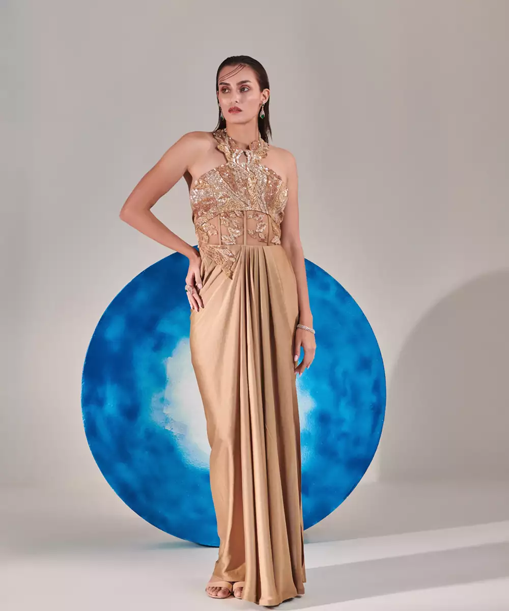 Featuring Cutwork Halter Neck Drape Gown With Tie Back Detail At The Back Colour: Gold Fabric: Satin Components : 1 Gown
