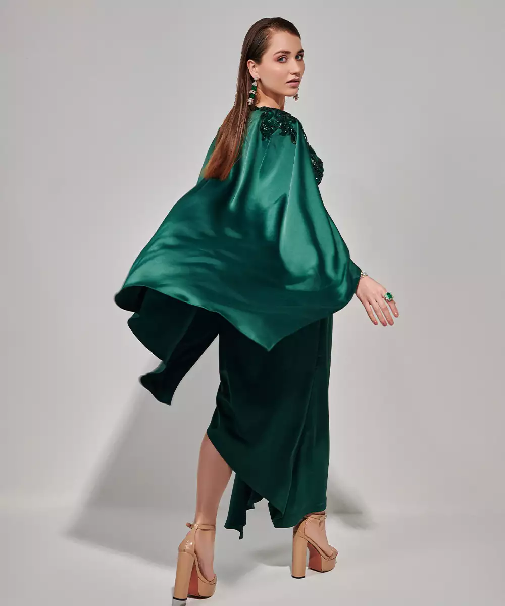 Cutwork Hand Embroidered Blouse , Cape And Asymmetric Drape Skirt Set .Blouse Closure Back Eye Hook Featuring Hand Embroidery In Hues Of Emerald Colour: Emerald Fabric: Satin Components : 1 Skirt / 1 Blouse / 1 Cape