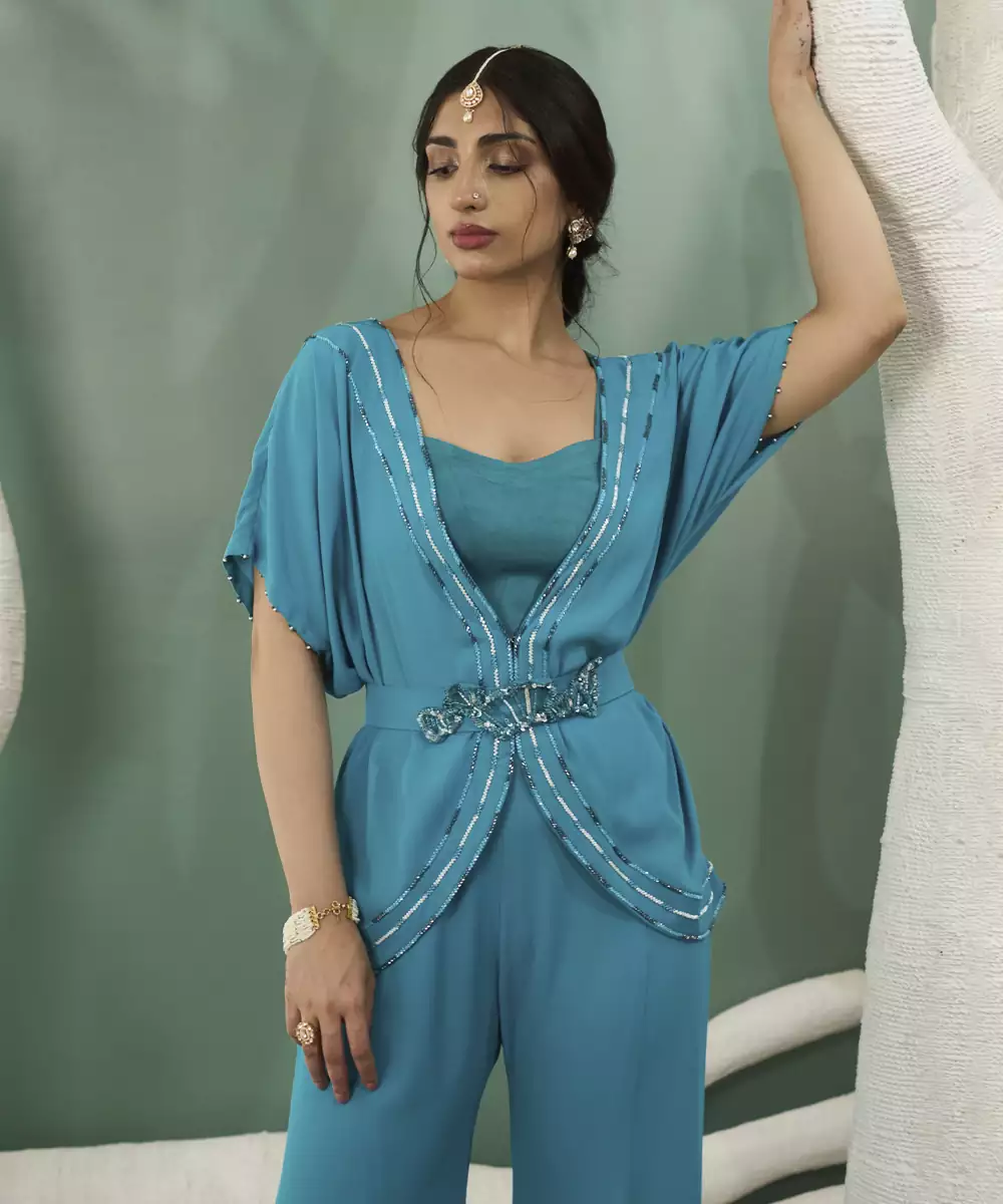 Featuring Firozi Blue Front Cross Tunic Paired With Flowy Pants In Geogette And Comes With Embroidered Belt. Finely Hand Crafted Using Traditional Embroidery With Katdana, Sequence, Beads Paired With A Matching Detachable Belt.