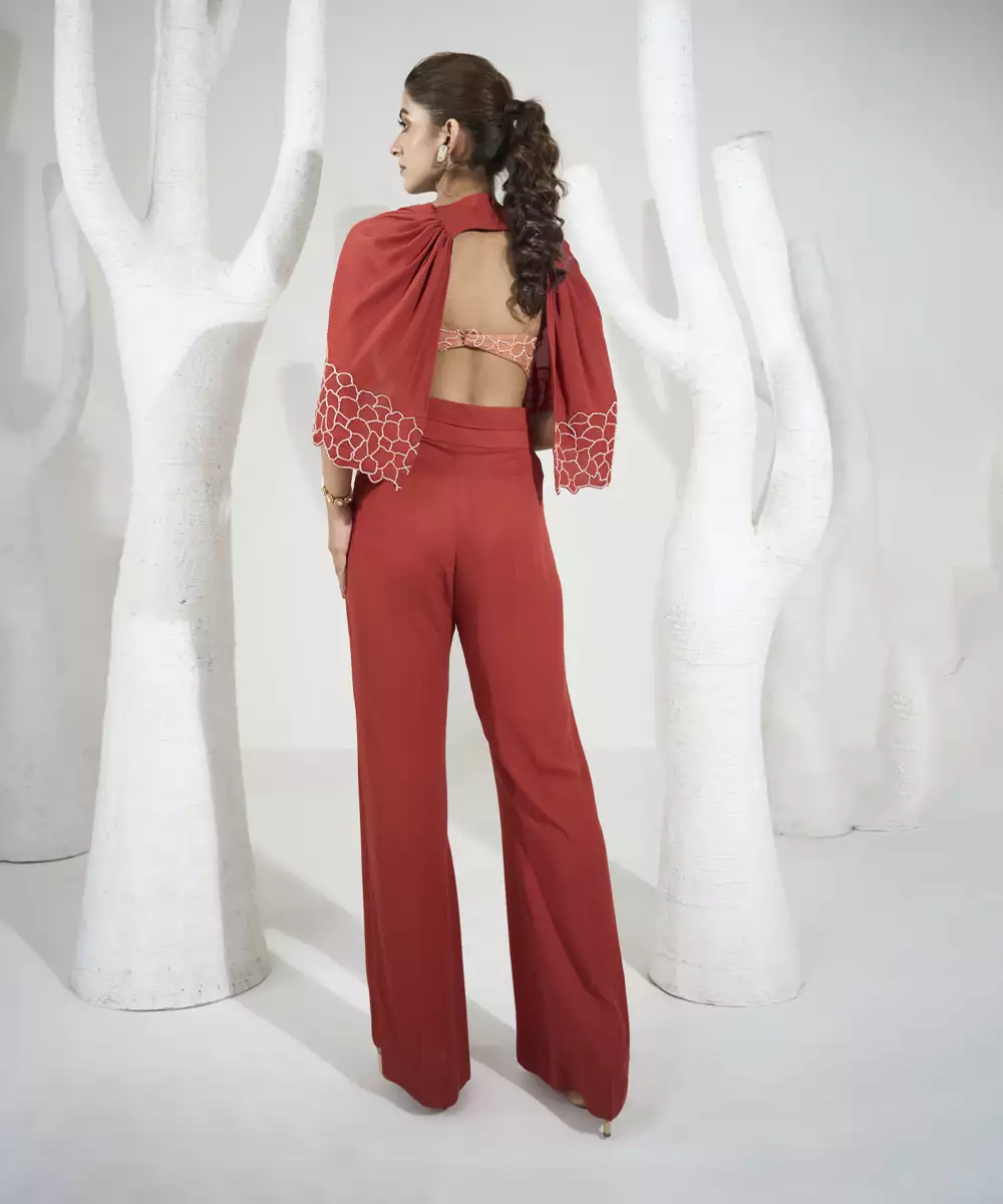 Featuring Rust Orange Hand Embroidered Cape With Pants In Geogette Comes With Viscose Organza Bustier & Cut Out Cape. Colour: Orange Fabric: Georgette Components : 1 Cape / 1 Pant / 1 Bustier