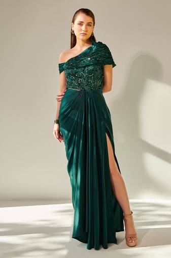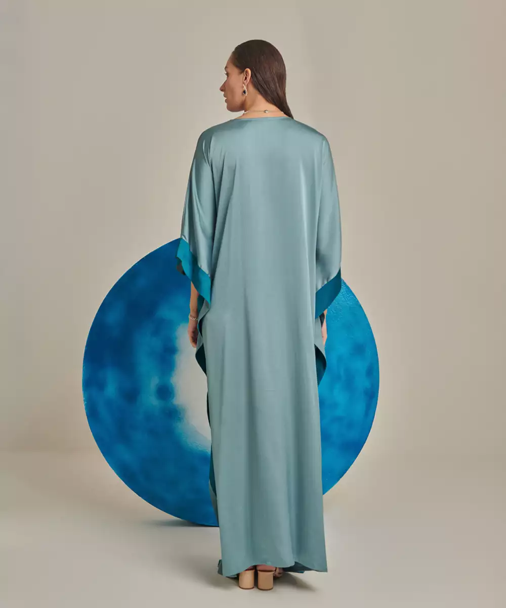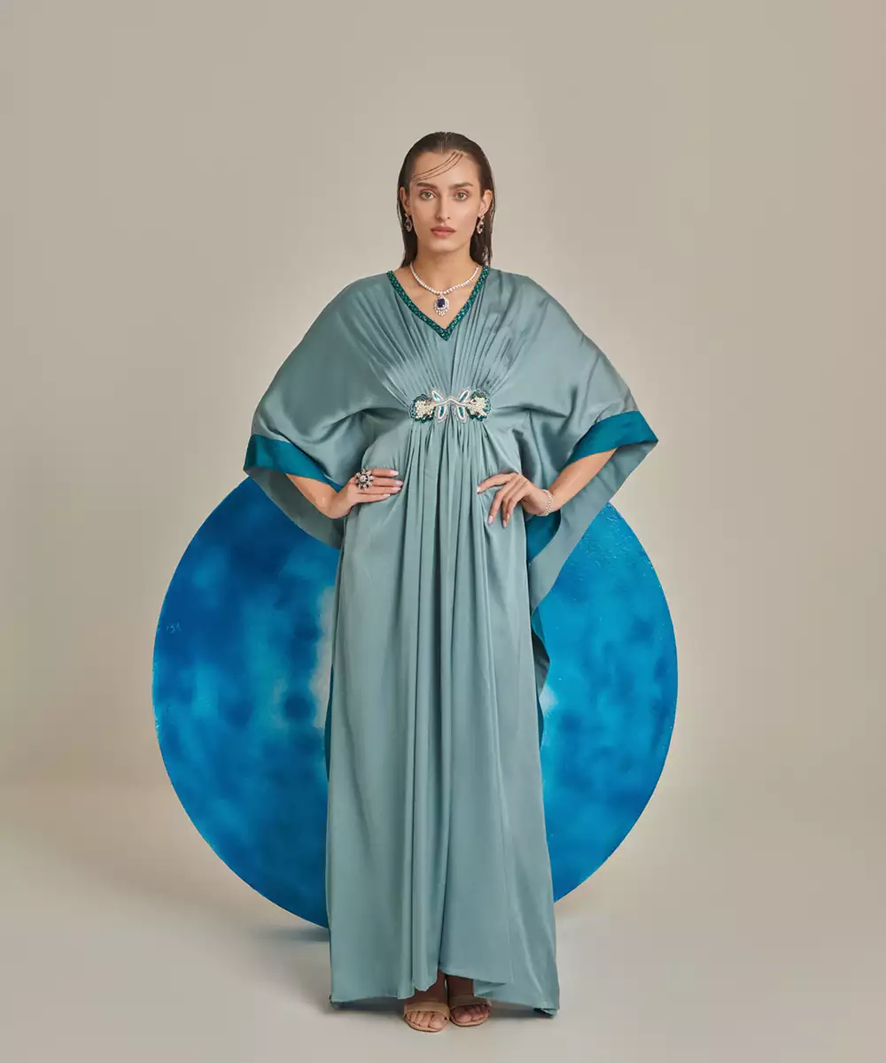 Sea Green Kaftan With Hand Embroidered Details Of Pearls, Katdana, Rhinestones, Beads Colour: Green Fabric: Satin Components : 1 Kaftan