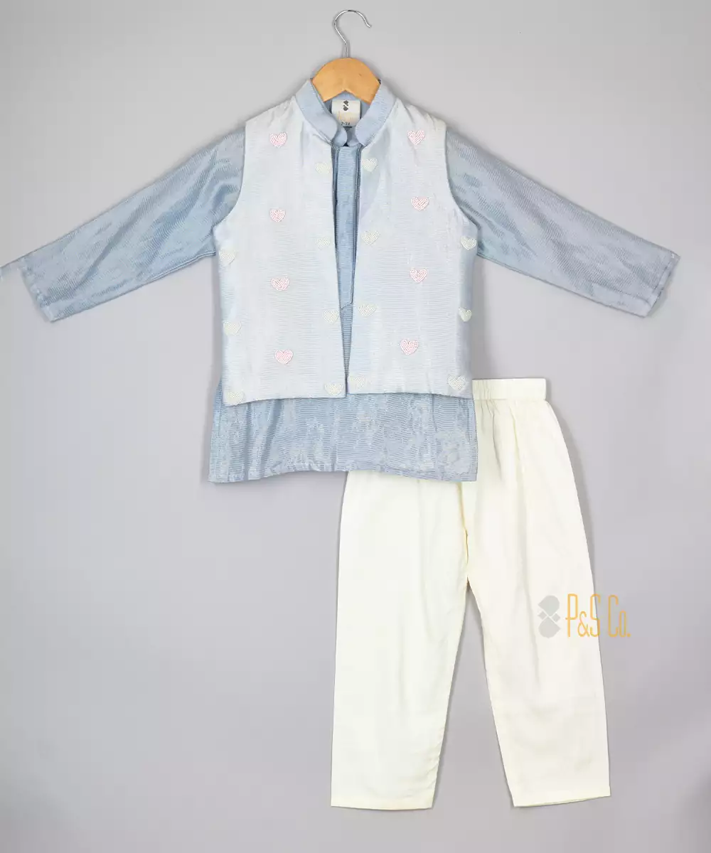 Blue Heart Jacket Kurta With Pants Colour: Blue Fabric: Tissue Components : 1 Jacket / 1 Kurta / 1 Pyjama
