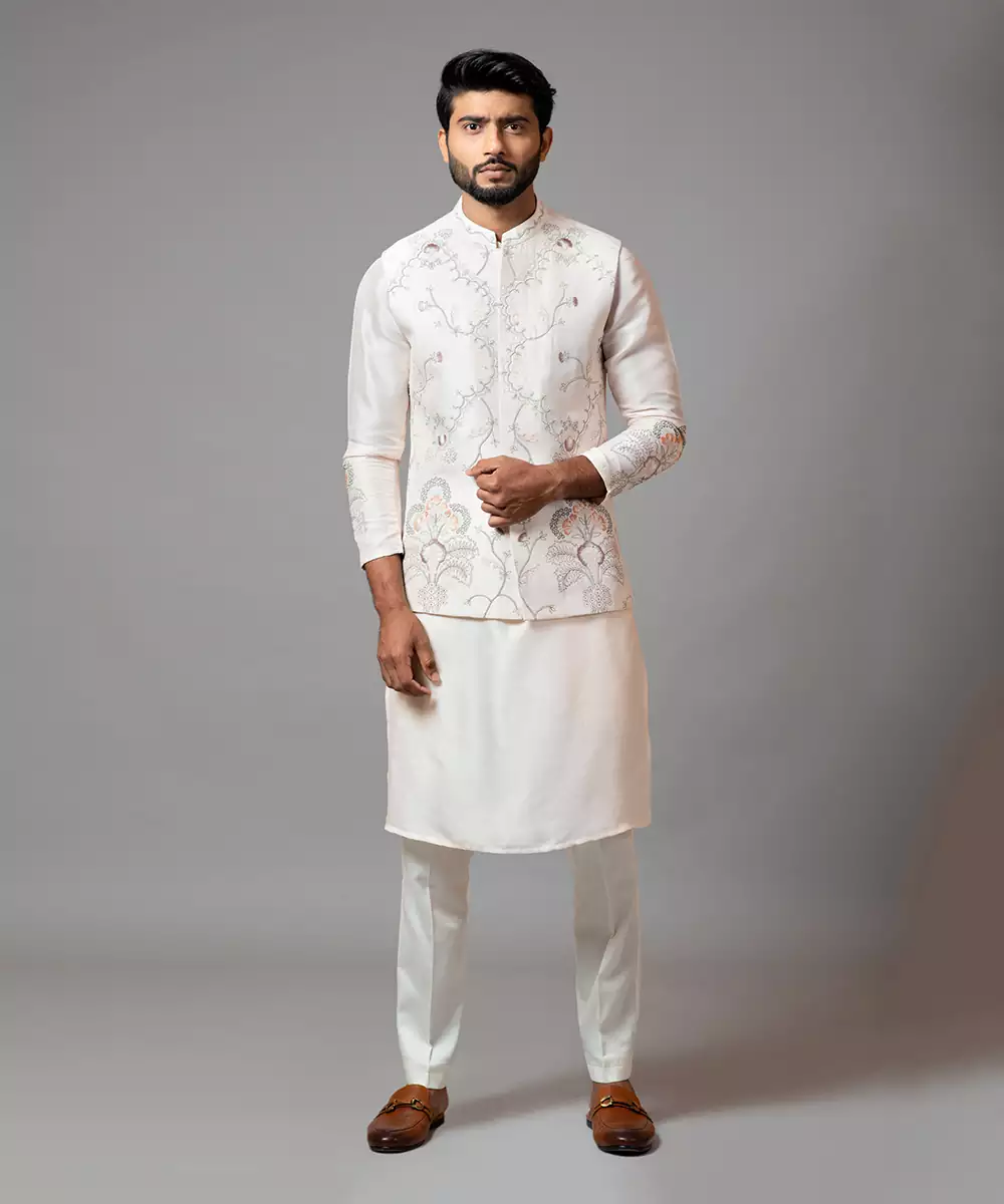 Baby Pink Nehru Jacket With Multi Colour Garden Themed Embroider.