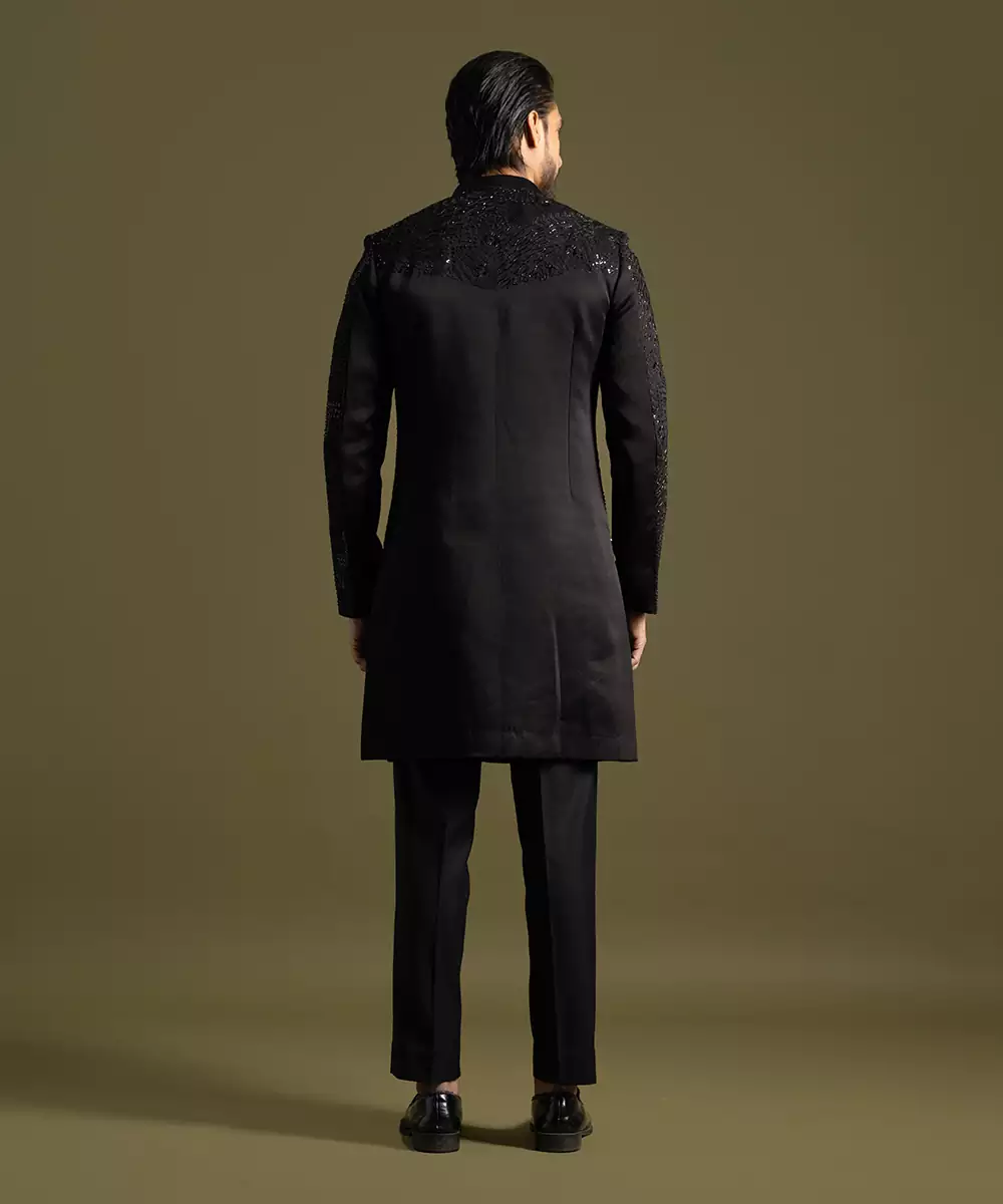 Embroidered Achkan Featuring Stitch Line Detail On Centre Panels, Full Sleeves & Mandarin Collar Is Paired With Cotton Pants.