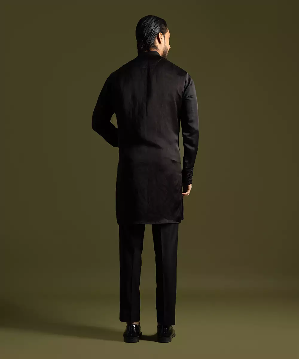 Kurta Featuring Full Sleeves, Round Neck Collar & Smocking Detailing Is Paired With Slim Fit Pants. Colour : Black Fabric : Kurta Linen Satin, Pant Cotton Components : 2 (Kurta, Pant) Work : Plain