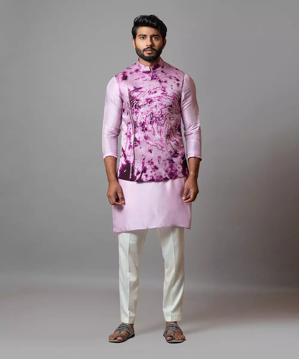 Fuchsia Pink Overlapping Nehru In Linen Satin With Marble Tie And Dye And Abstract Resham Embroidery. Color Of The Actual Garment May Vary Due To Lighting Conditions During The Shoot .