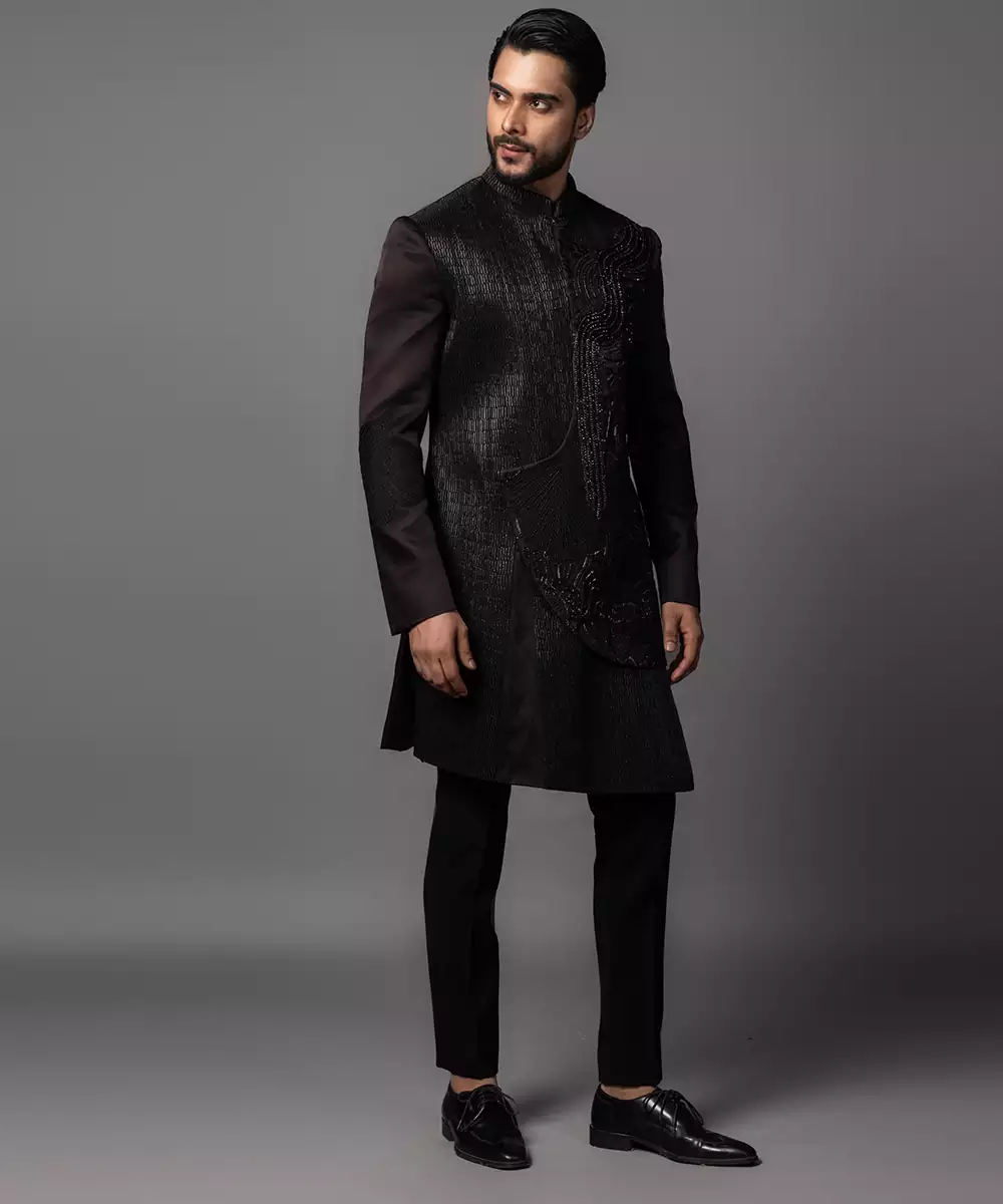 A Stone Brown Assymetric Achkan With Stone, Leather Cord And Resham Embroidery. Colour: Brown Fabric: Linen Satin Components : 1 Achkan , 1 Pant