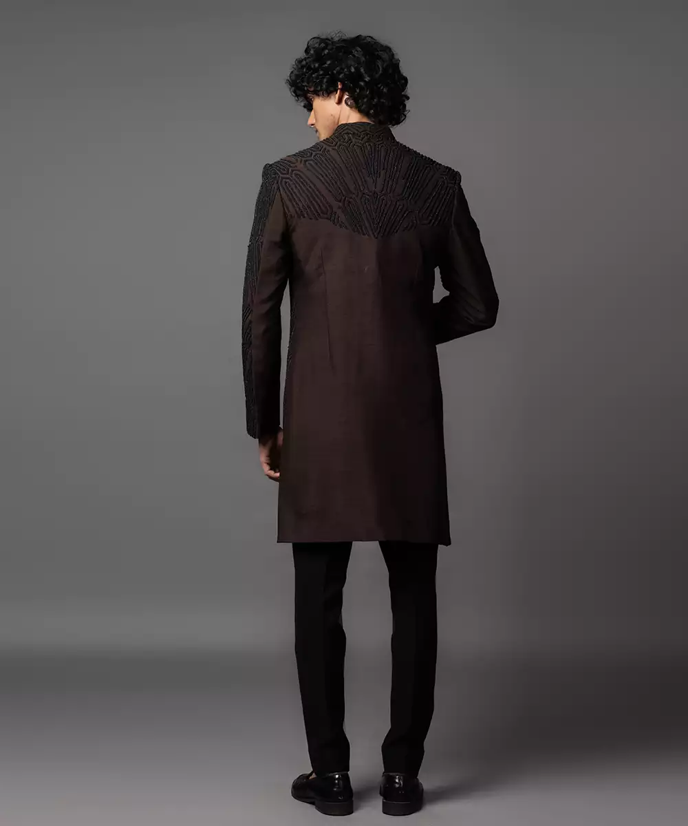 A Coco Brown Double Panel Achkan Embroidred With Black Moti Creating A Diamond Shape It Is Paired With An Embroidred With