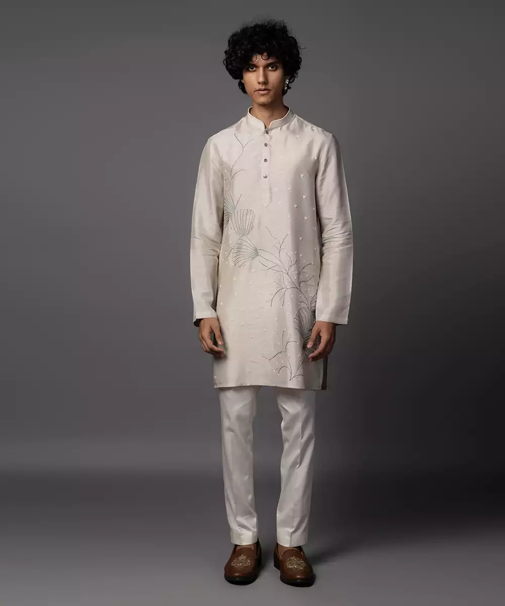 A Grey Bam Silk Kurta Showing A Blooming Flower Using Reshams And Moti Colour: Grey Fabric: Silk Components : 1 Kurta , 1 Pajama
