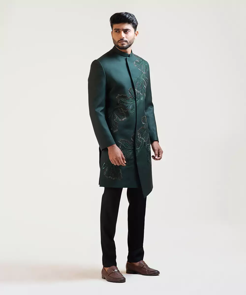 Green A Symmetric Achkan Highlighted With Abstract Flowy Lineart Embroidery Using Cod Strings, Sequin And Different Threadwork Paired Up With Black Trouser.