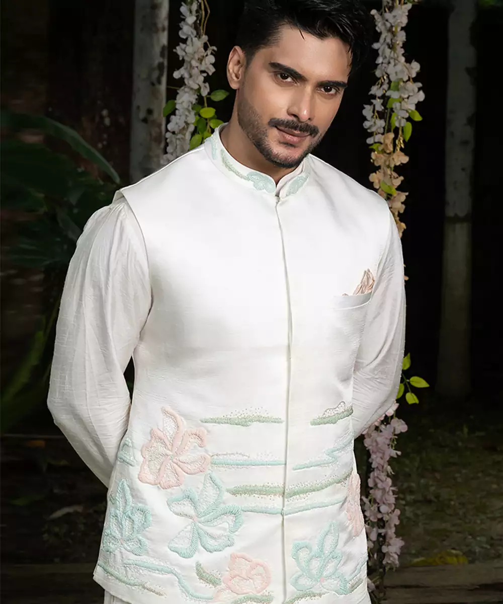 This Ivory Embroidered Linen Nehru Jacket Set Exudes Classic Elegance With Modern Sophistication. The Breathable Linen Kurta Is Complemented By A Finely Embroidered Nehru Jacket That Enhances Its Refined Appeal. Ideal For Weddings, Festive Occasions, And Cultural Events, It Offers A Polished And Graceful Traditional Style.