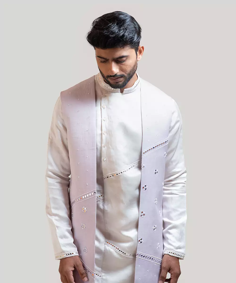 Lilac Long Nehru Highlighted With Mirror Work Motiff, Pearl Sequins And Chir Embroidery With Cream Layered Panel Kurta Highlighted With Mirror Line Work Embroidery And Paired With A Cream Narrow Fitted Pant Pajama.