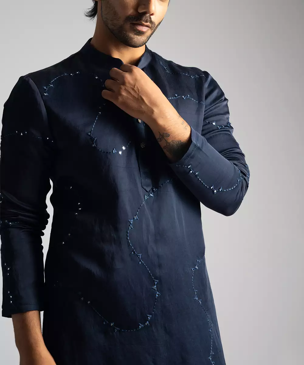 Kurta Featuring Full Sleeves, Mandarin Collar And Abtract Mirrorwork Detailing Is Paired With Matching Pajama. Colour : Midnight Blue Fabric : Kurta Linen Satin , Pant Cotton Components : 2 (Kurta, Pant) Work : Mirrorwork