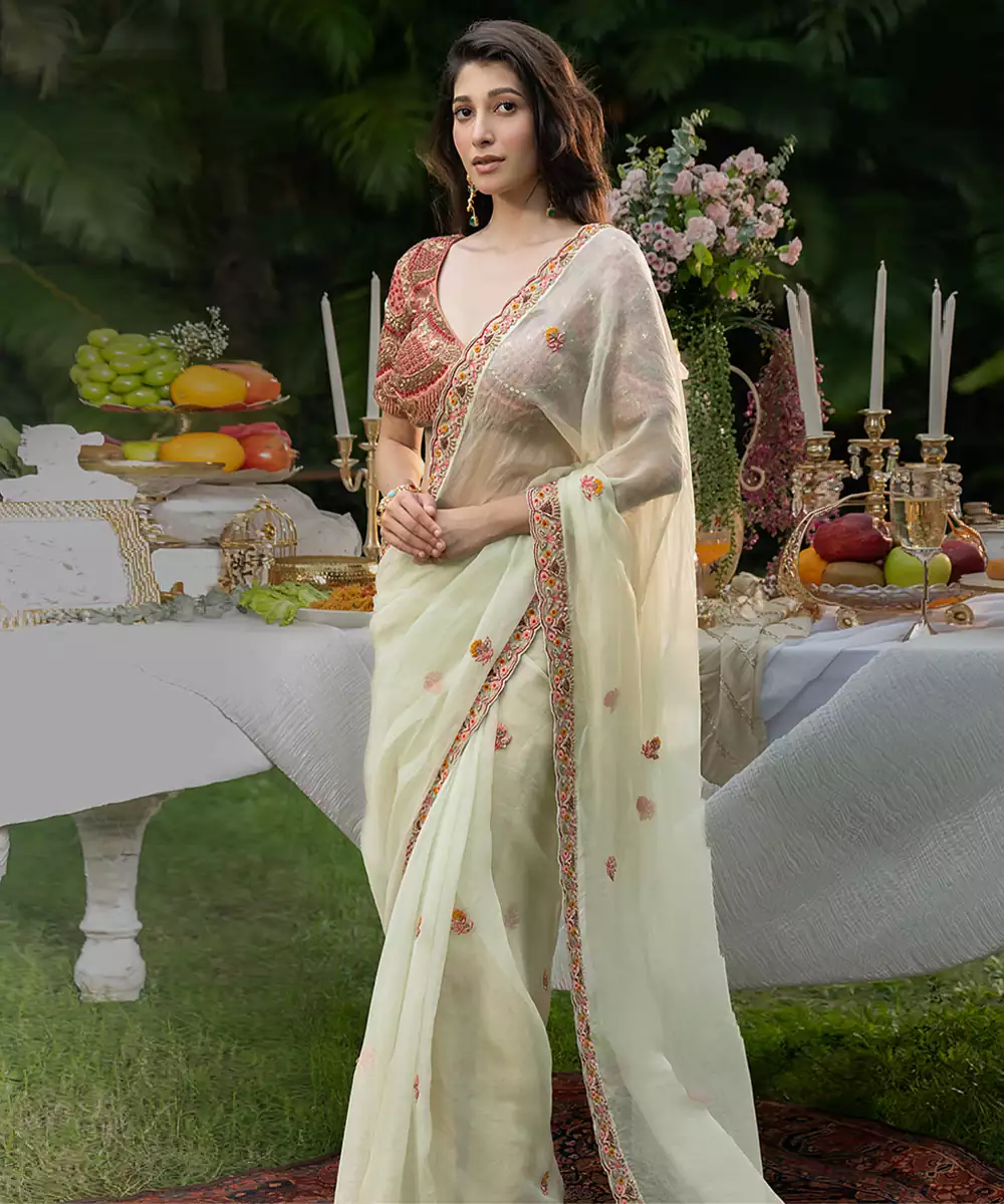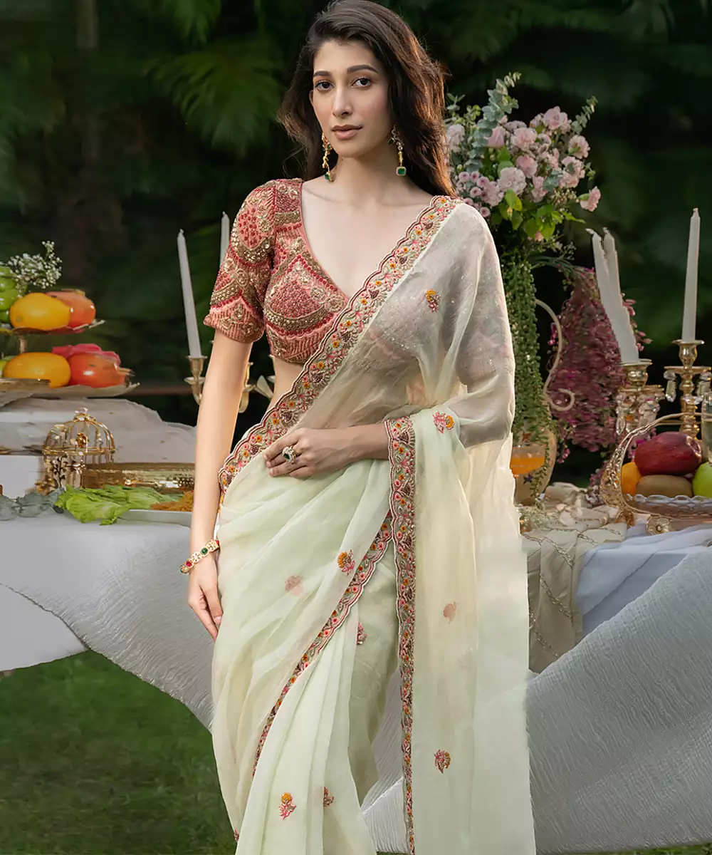 This Mint Green Embroidered Organza Saree Set Offers A Refreshing And Elegant Ethnic Look. The Airy Organza Fabric Drapes Beautifully, While Intricate Embroidery Enhances Its Refined Charm. Paired With A Coordinated Blouse, This Ensemble Is Ideal For Festive Occasions, Celebrations, And Stylish Daytime Events.