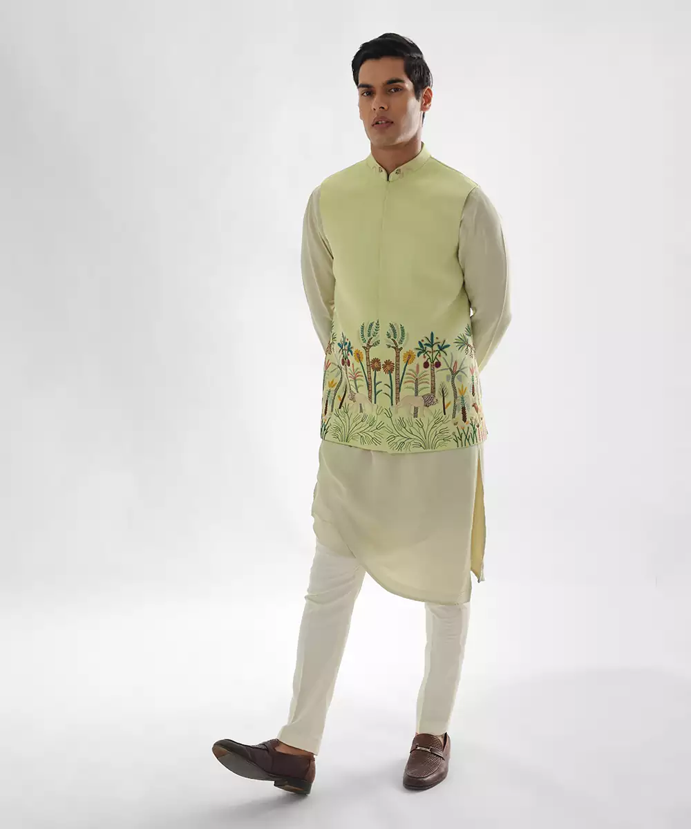 Mint Green Nehru Jacket With The Use Of Threadwork Paired With Mint Green Plain Kurta And Cream Pant Pajama.