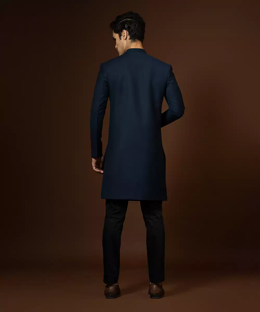 Navy Blue Overlapping Achkan With Embroidery On The Overlapping Panel, With Black Zardosi Work And Highlights Of Katdana, Piping And Chir. Paired With Black Slimfit Trouser.