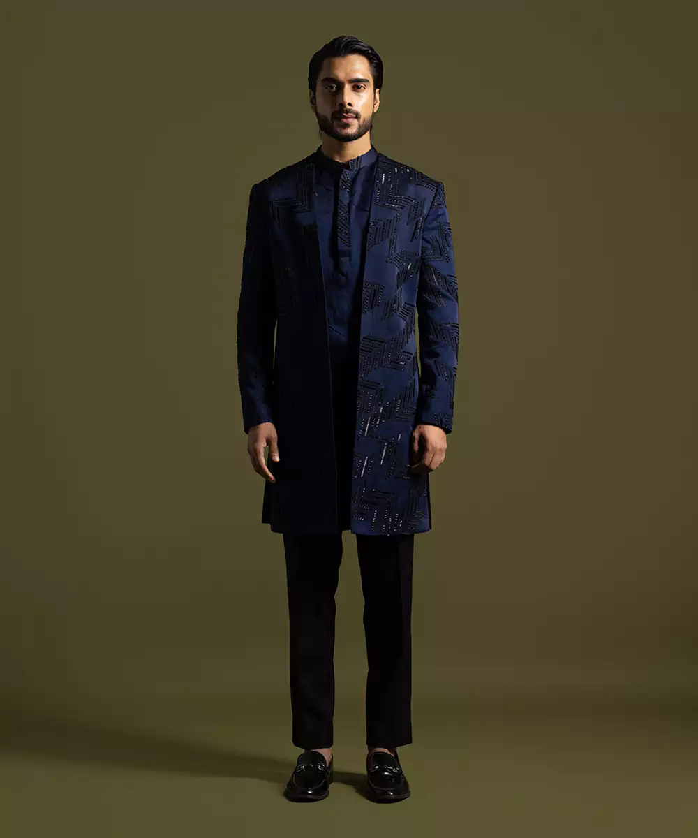 Open Embroidered Achkan Featuring Herringbone Shape Detail All Over & Full Sleeves, Is Paired With A Kurta Featuring Mandarin Collar & Embroidered Placket And A Plain Pant.