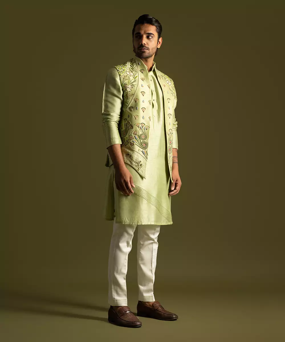 Sleeveless Open Nehru Jacket Features Egyptian Inspired Multicolour Threadwork Embroidery. Colour : Pistachio Green Fabric : Bamberg Silk Components : 1 Jacket Work : Embroidery