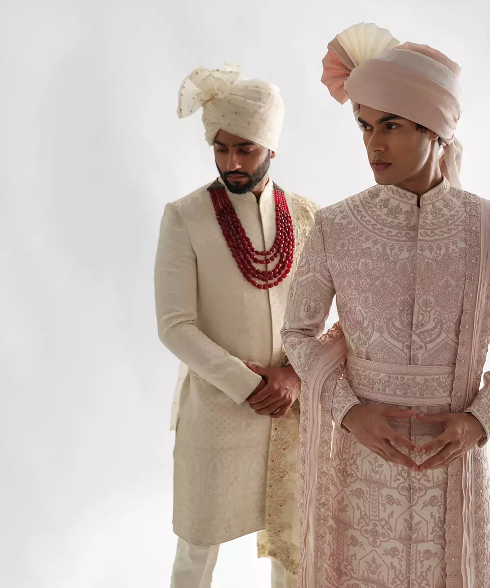Powder Pink Sherwani Set With Intricate Threadwork All Over And Highlights Using Moti And Sequin Work. The Set Includes Sherwani Jacket, Dupatta, Kurta And Pants.