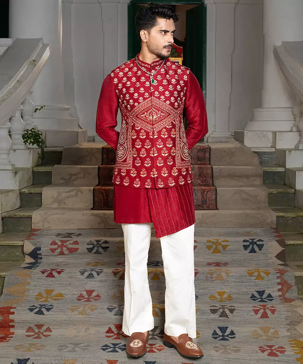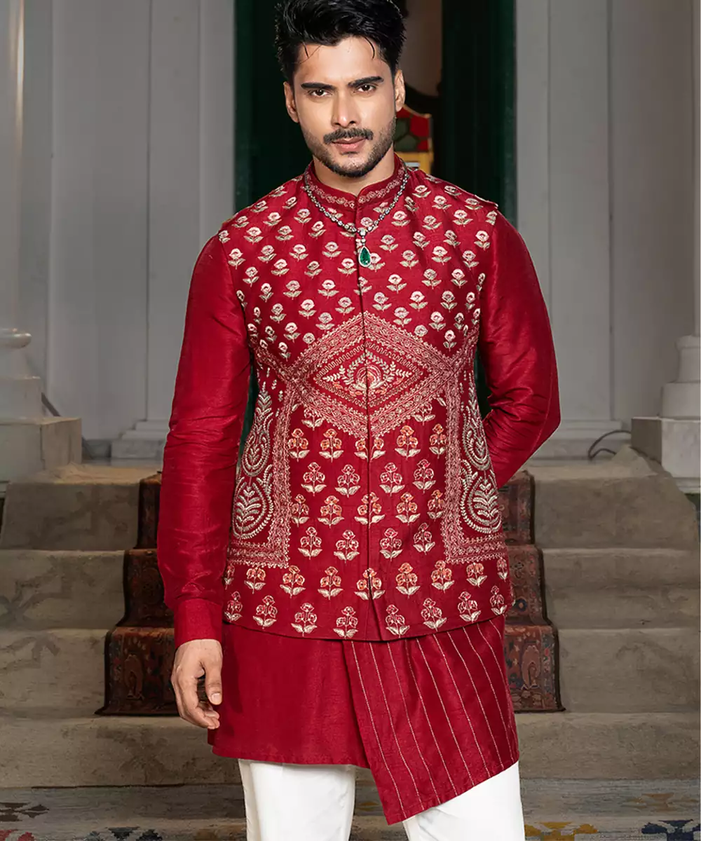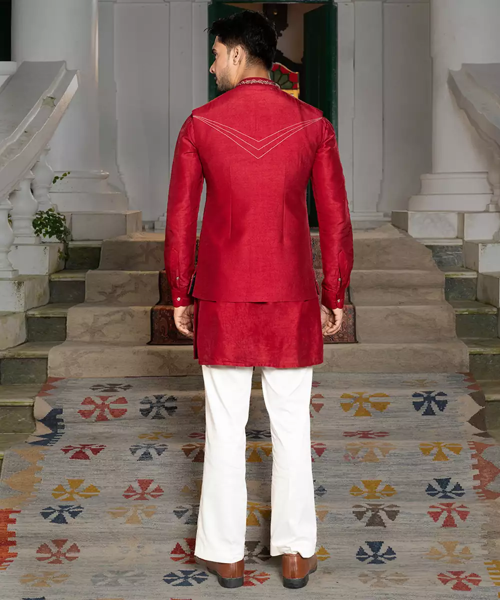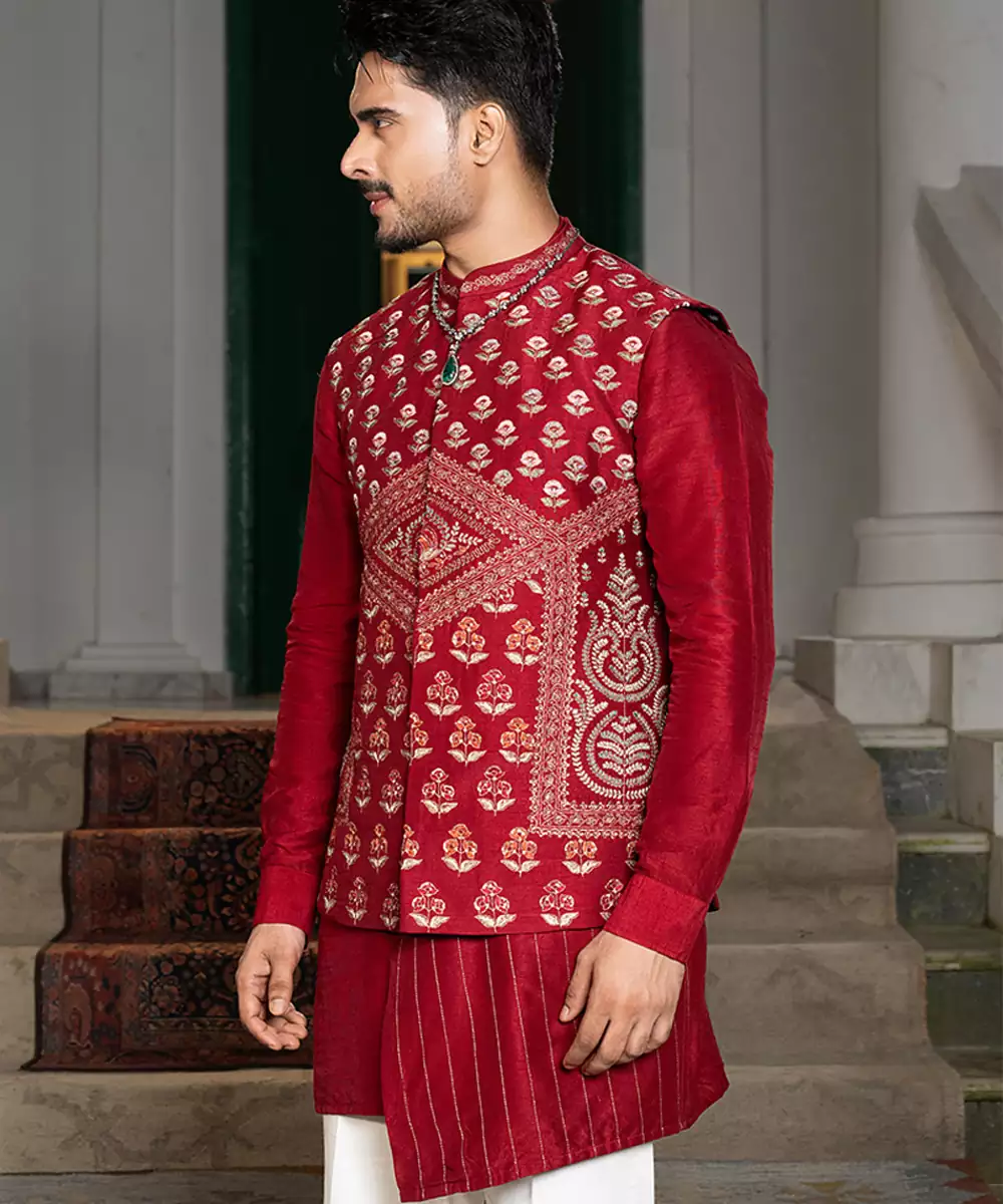 This Red Embroidered Silk Kurta Jacket Set Reflects Regal Elegance With Its Rich Fabric And Intricate Detailing. The Luxurious Silk Kurta Is Paired With A Finely Embroidered Jacket That Enhances Its Festive Charm. Perfect For Weddings, Receptions, And Cultural Celebrations, This Ensemble Blends Traditional Craftsmanship With Modern Sophistication For A Distinguished Ethnic Look.