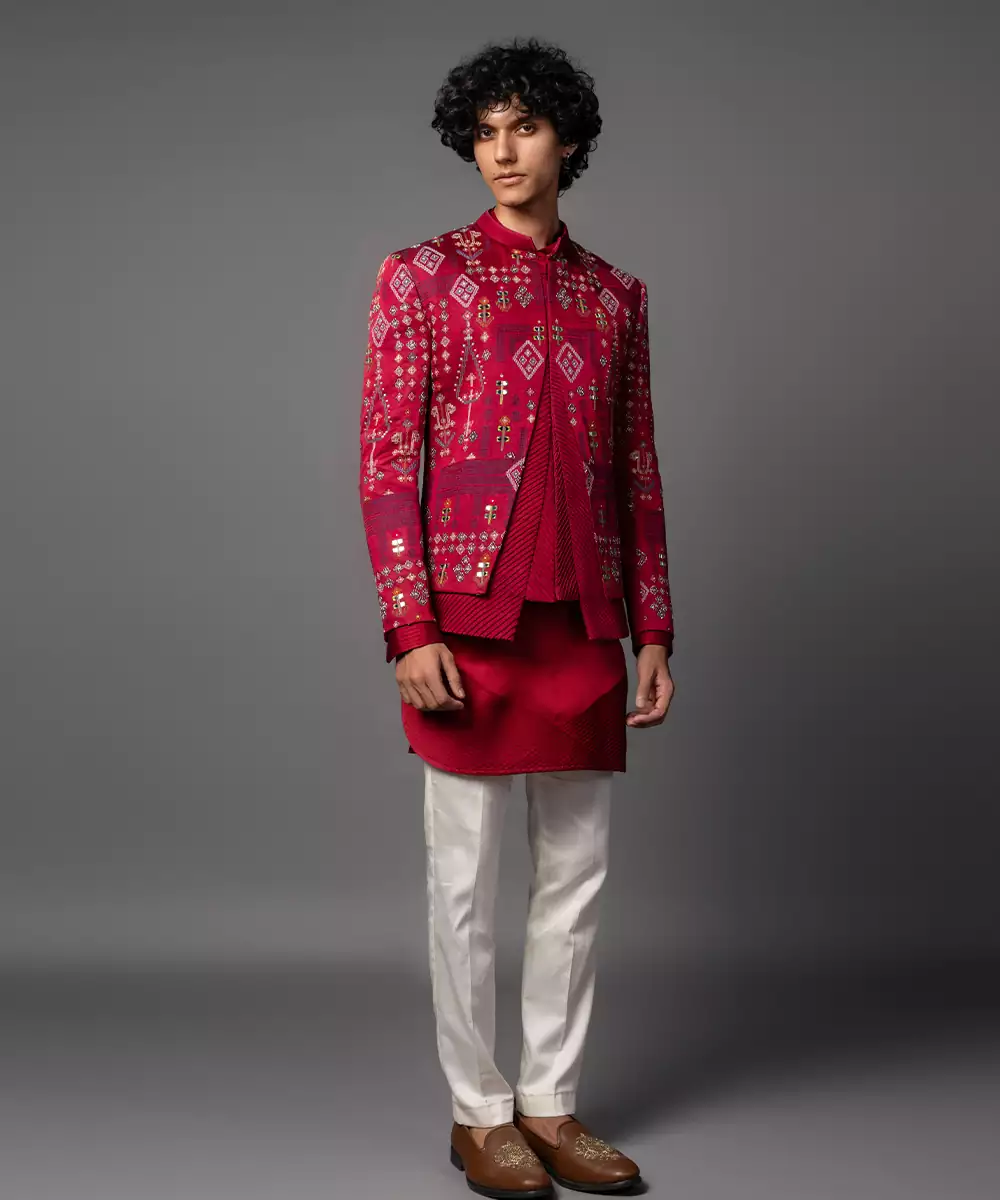 The Red Double Panelled Prince Coat With Multi Color Threadwork And Mirrorwork And Pintuck Detailing. The Set Is Paired With Pintuck Detailed Short Kurta And Cream Pant Pajama.