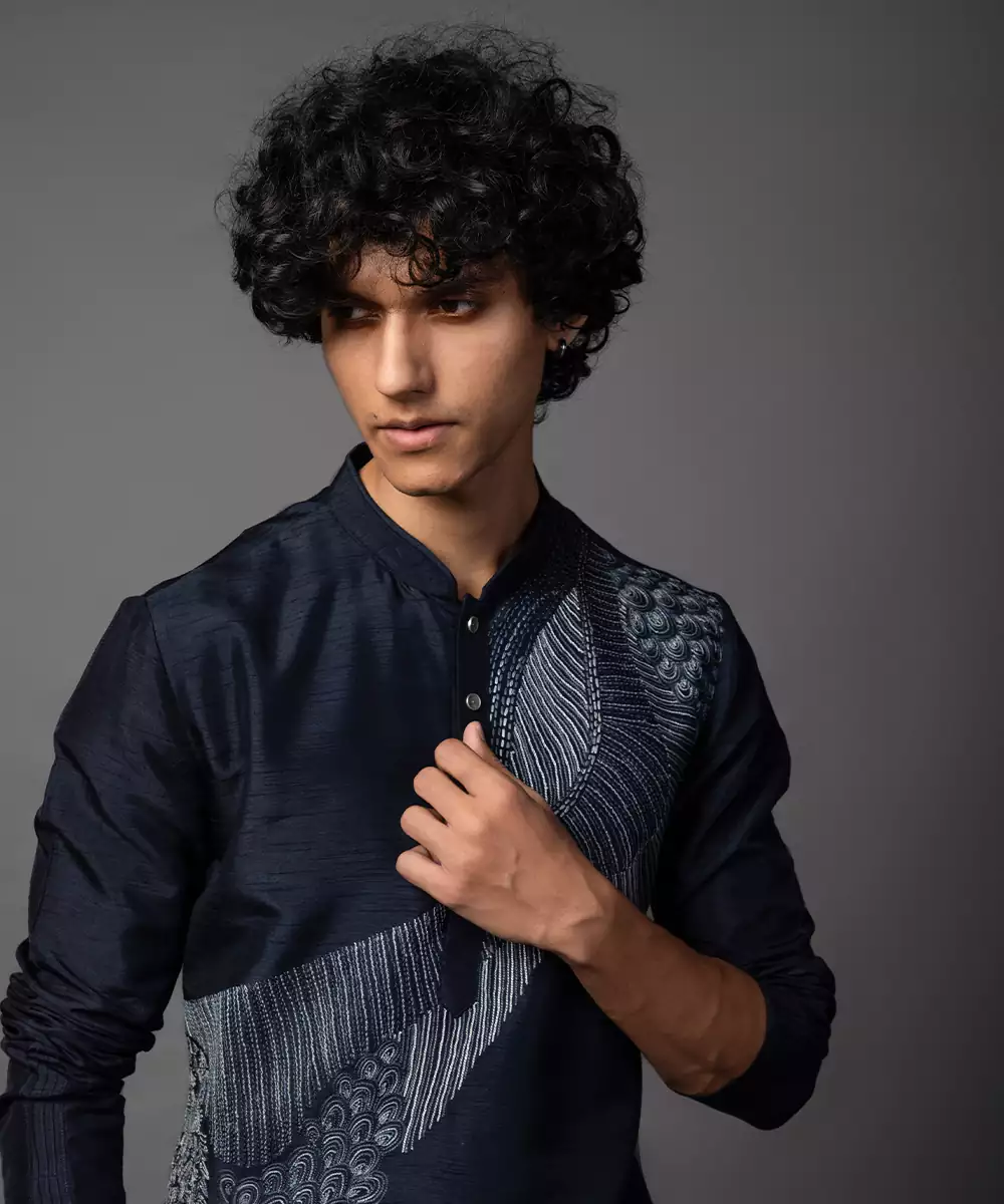 A Navy Blue Kurta With Abstract Embroidery Usig Kantha And Frenchknots. Colour: Blue Fabric: Silk Components : 1 Kurta , 1 Pajama