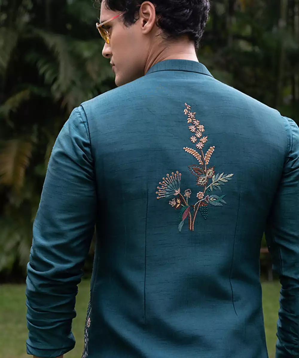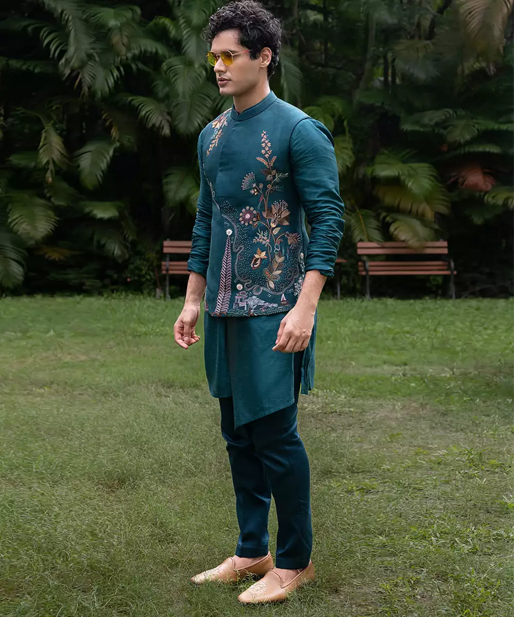 This Teal Blue Embroidered Silk Kurta Jacket Set Showcases Luxurious Craftsmanship And Rich Color. The Silk Kurta Drapes Beautifully While Intricate Embroidery Adds Refined Elegance. Paired With A Coordinated Jacket, This Ensemble Creates A Regal Ethnic Look Perfect For Weddings, Receptions, And Festive Celebrations.