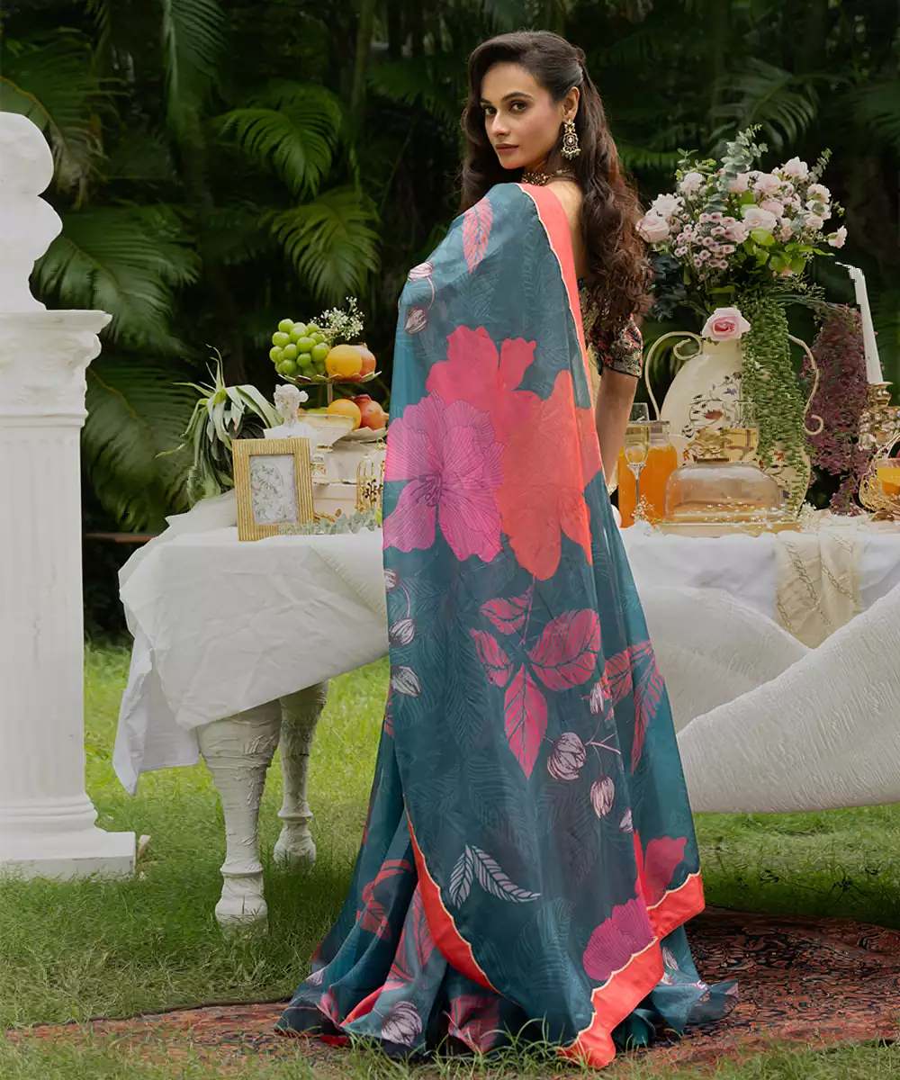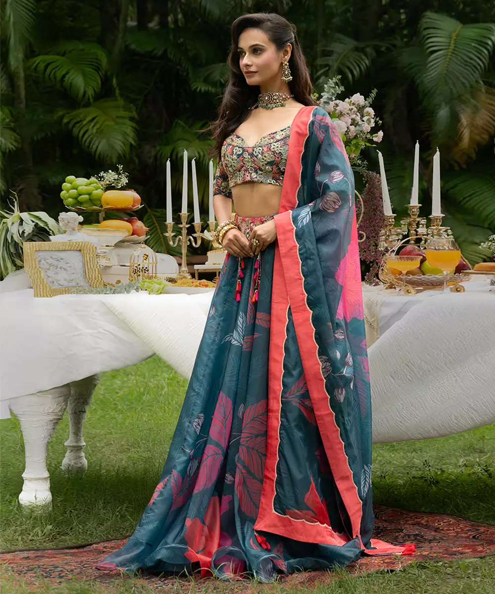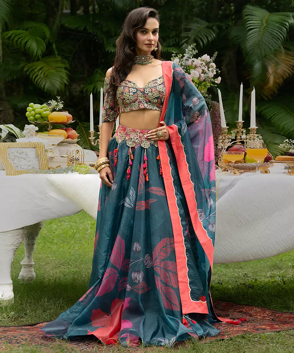 Teal Printed Organza Lehenga Set