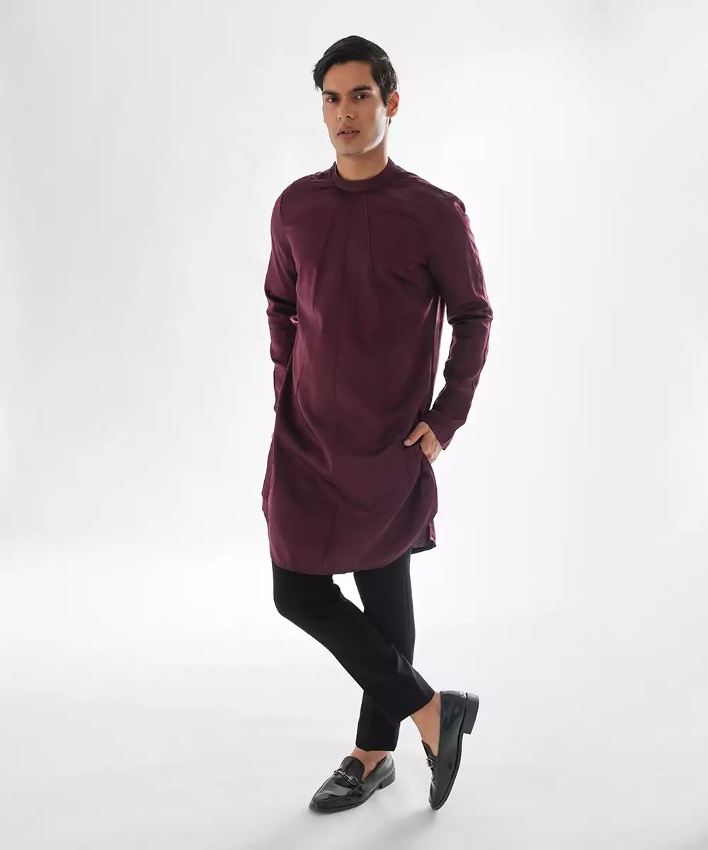 Vivid Magenta Coloured Kurta In Satin With Pintucks Detailing Paired With Black Pant Pajama.