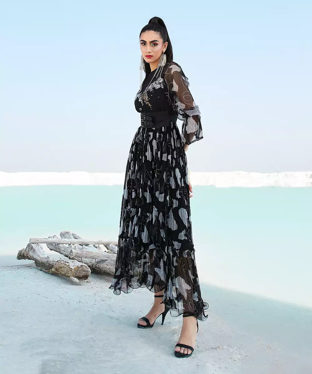 Black And White Palm Grove Printed Tier Dress In Chiffon Cinched With A Broad Belt.