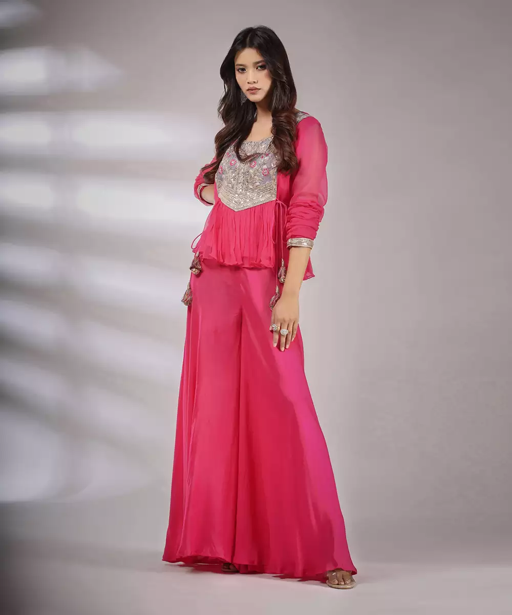 Featuring Our Haseena Folk Co Ord Set In The Color Hot Pink With Resam Marodi Peplum Top And Flared Pants Withh Tassel Details.