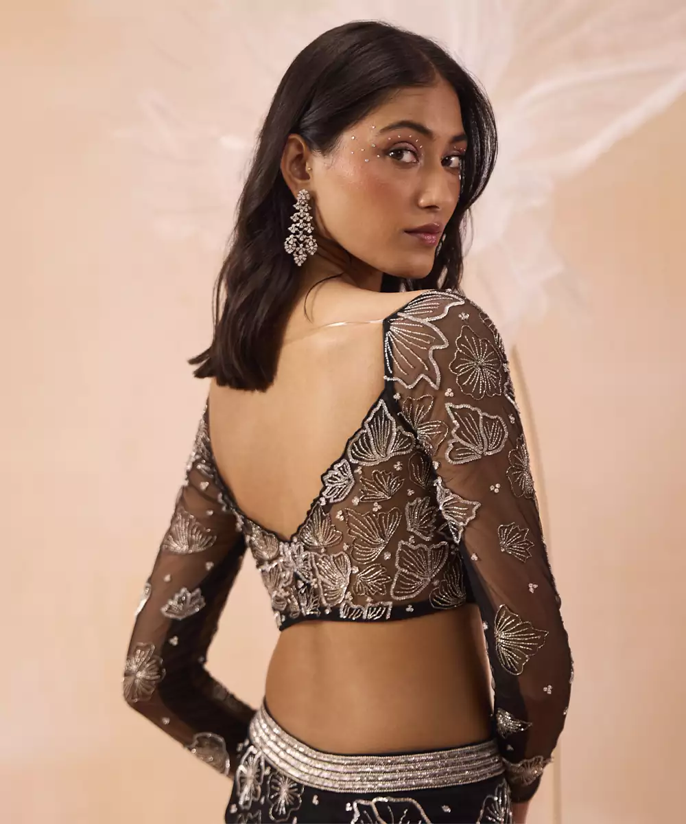 Black Fishcut Lehanga Embellished With Big Floral Scattering Motif, Cutwork Details On Blouse Neckline Paired With Dupatta. Colour: Black Fabric: Satin Components : 1 Lehenga / 1 Blouse / 1 Dupatta