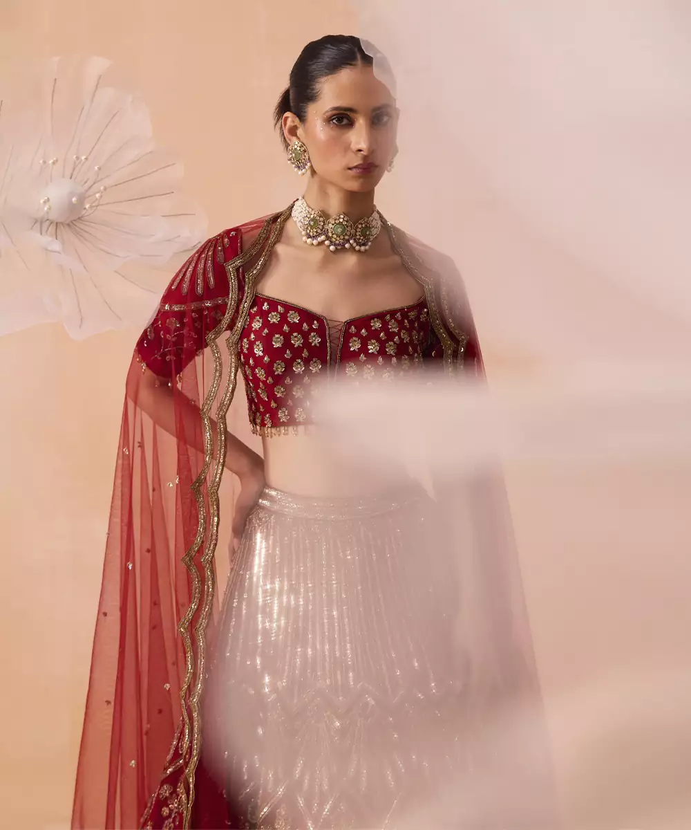 A Dreamy Lehanga With Intricate Floral And Geometric Embroidered Motifs, Paired With Butta Work Blouse And Scalloped Hand Embroidered Dupatta.