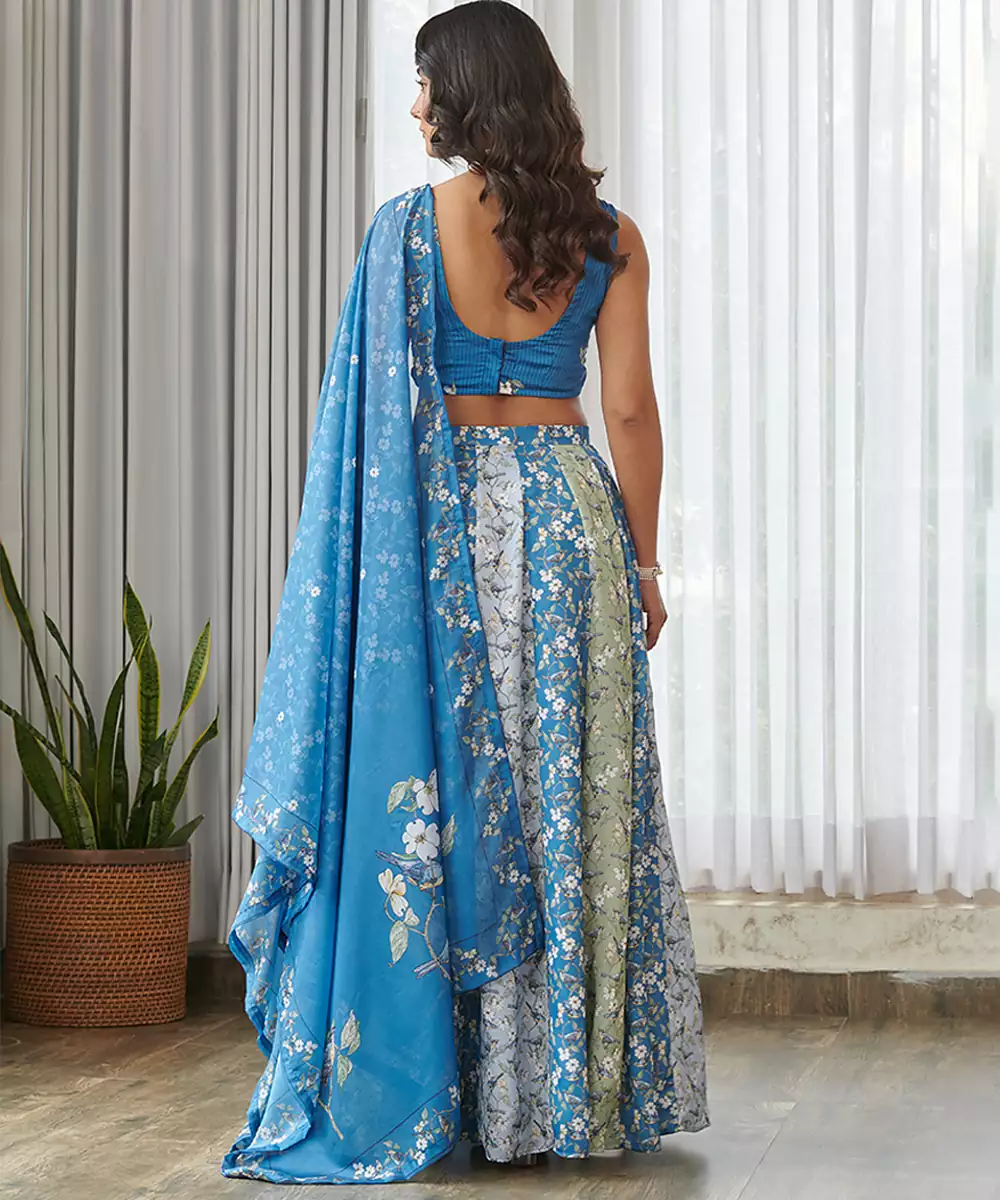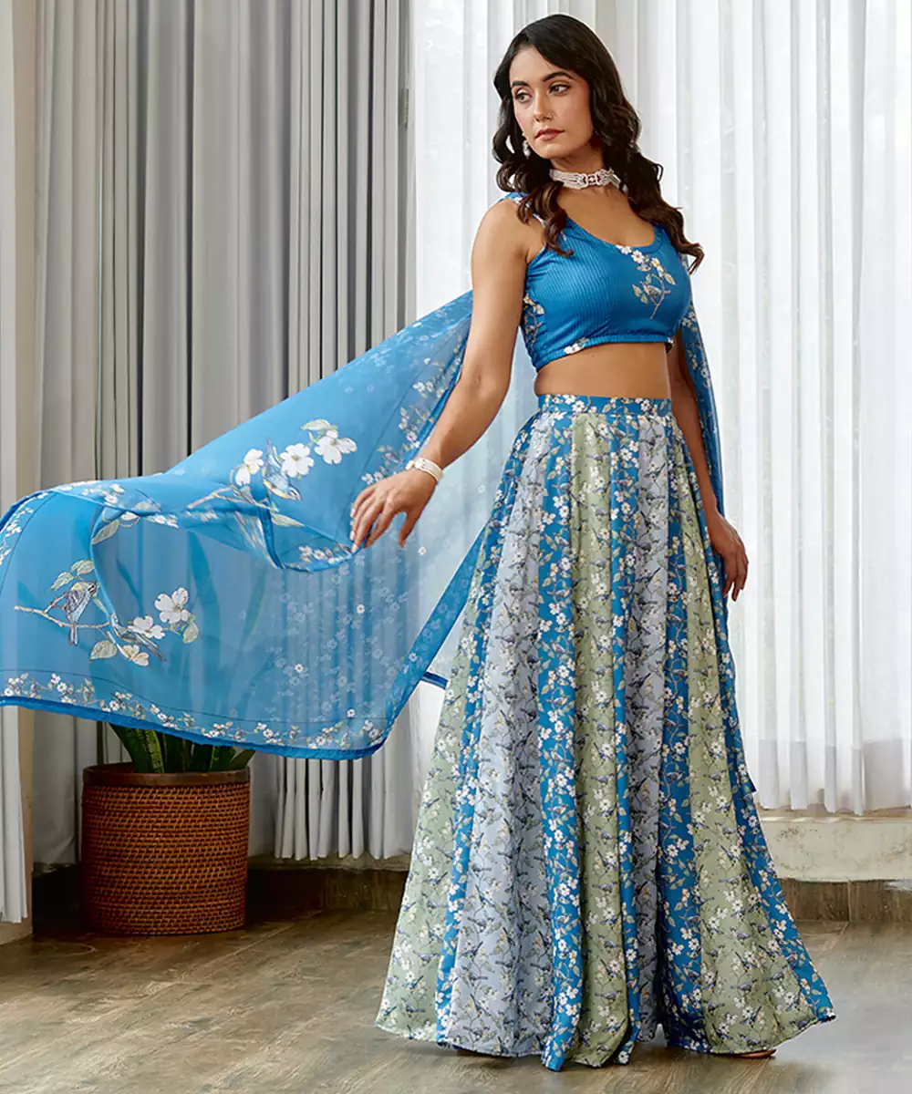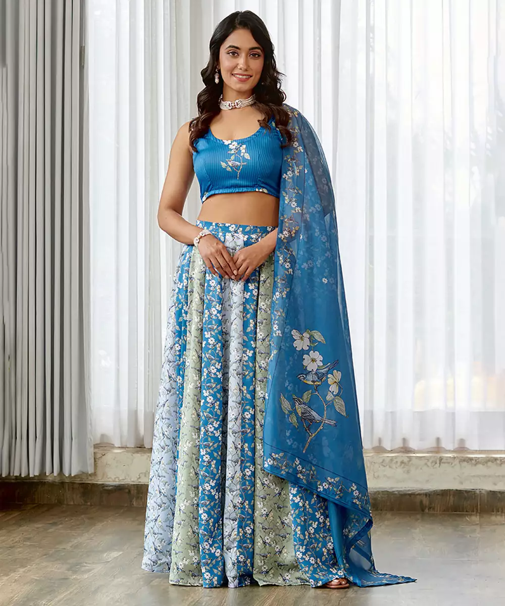 A Vibrant Floral Kalidar Lehenga Designed For Effortless Twirls — Fun, Festive, And Elegant While Staying Light And Fuss‑Free. Perfect For Celebrations Where Comfort Meets Charm.