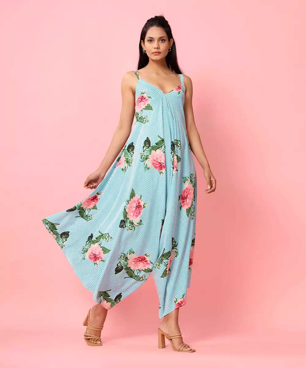 Blue Striped Floral Palazzo Jumpsuit Is A Free Size, Flowy And Breezy Jumpsuit .