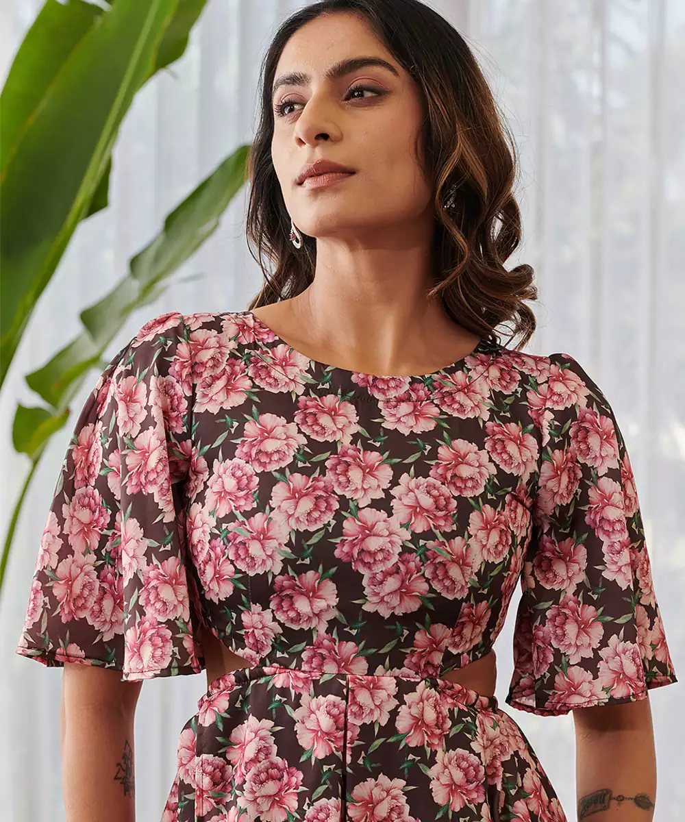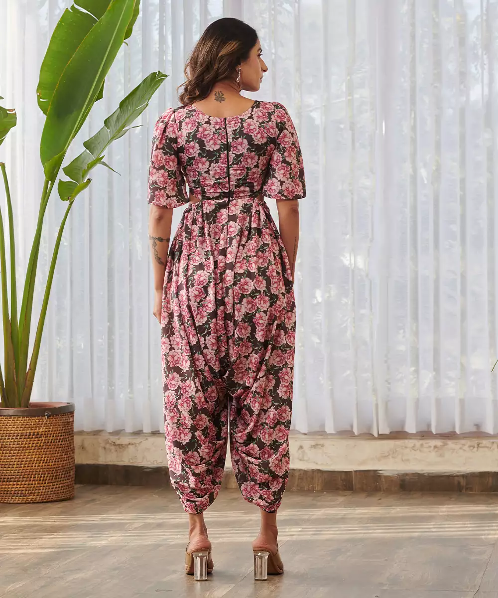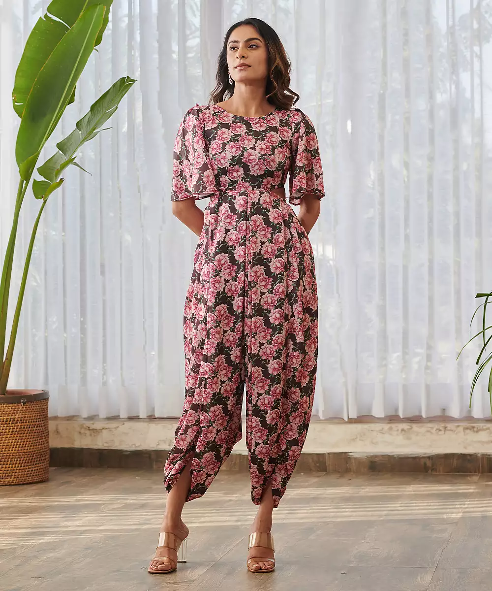 This Burgundy Printed Swiss Satin Jumpsuit Offers A Luxurious Feel With Its Smooth Satin Texture. The Rich Color And Elegant Prints Enhance Its Sophisticated Charm. Designed For Comfort And Style, It Is Perfect For Evening Events, Parties, And Festive Celebrations.