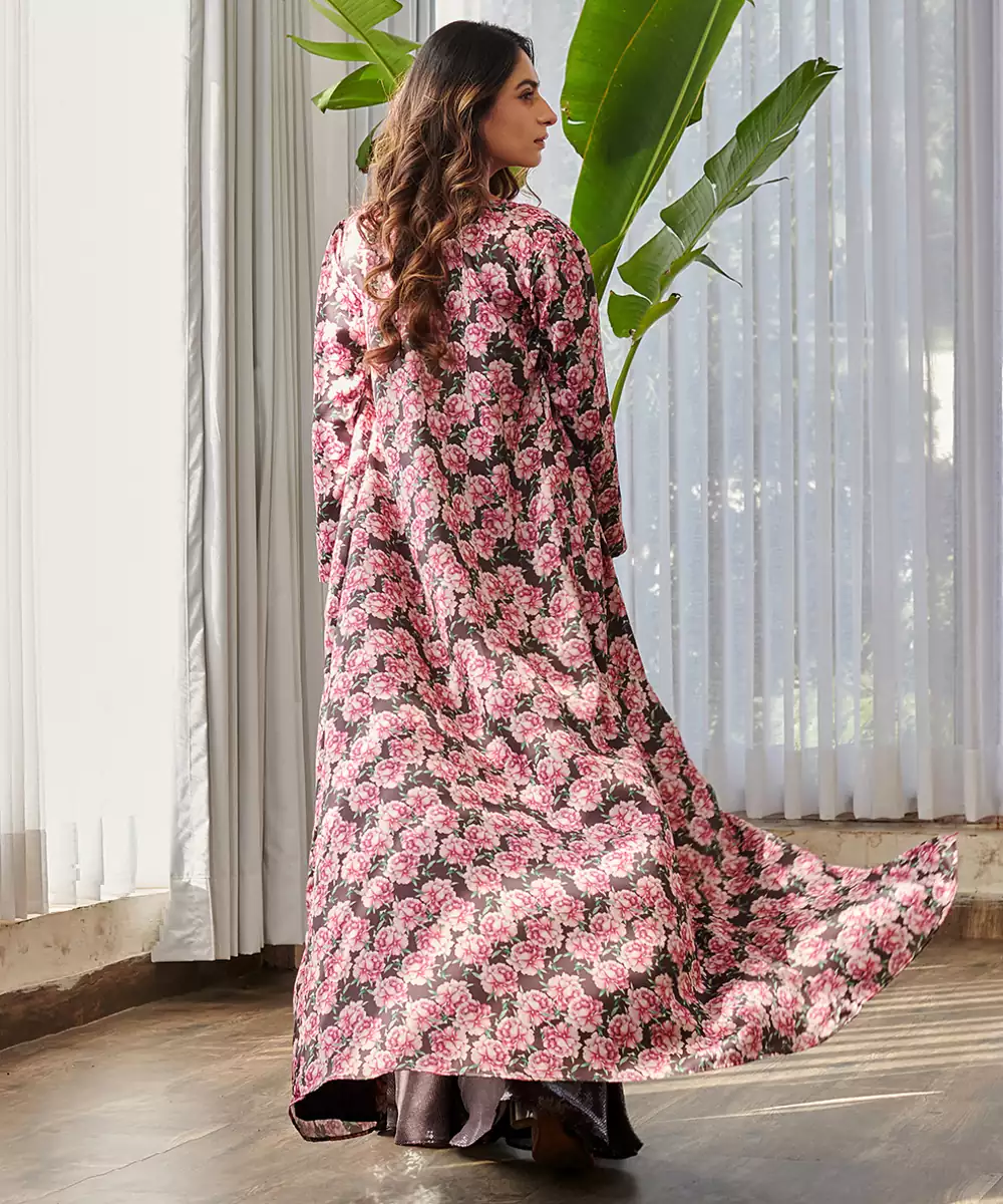 Dark Brown Embroidered Satin Fusion Co Ord Set